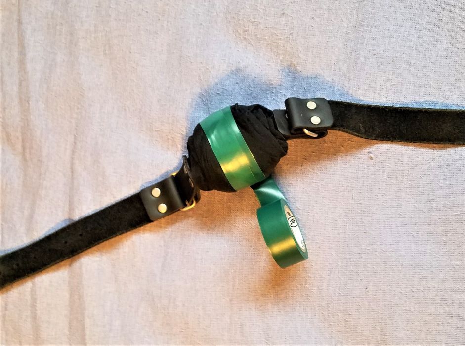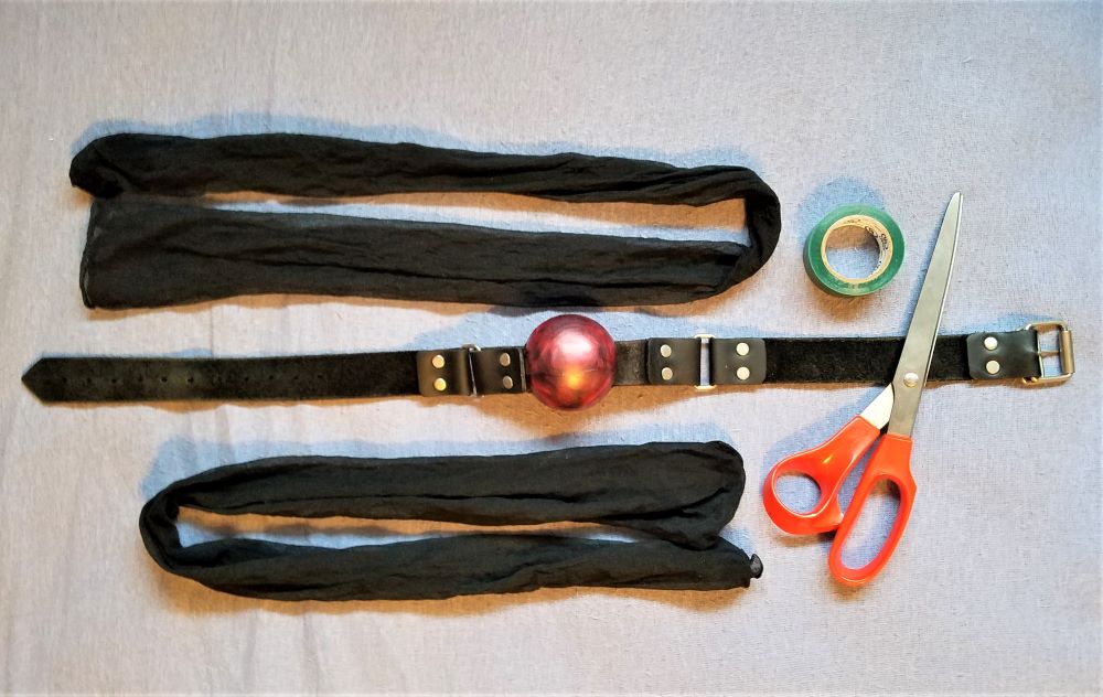 Here's all we need. A ball gag, obviously. 1 or 2 nylon legs. Electrical tape. Scissors. The nylon acts as padding to bulk up and soften the ball. The electrical tape is used because it's a softer rubber-like material, and it comes in a variety of colors. Bonus!