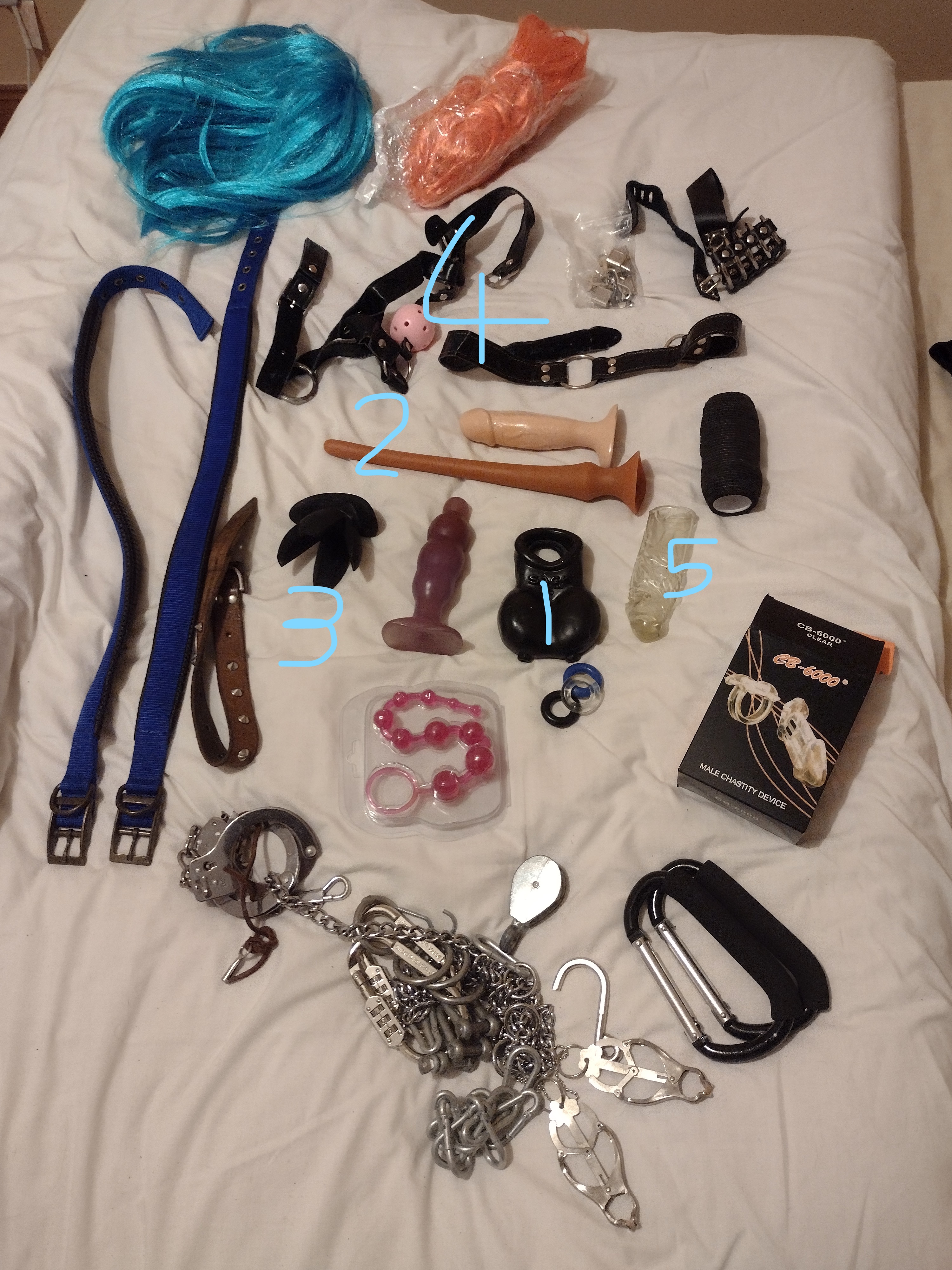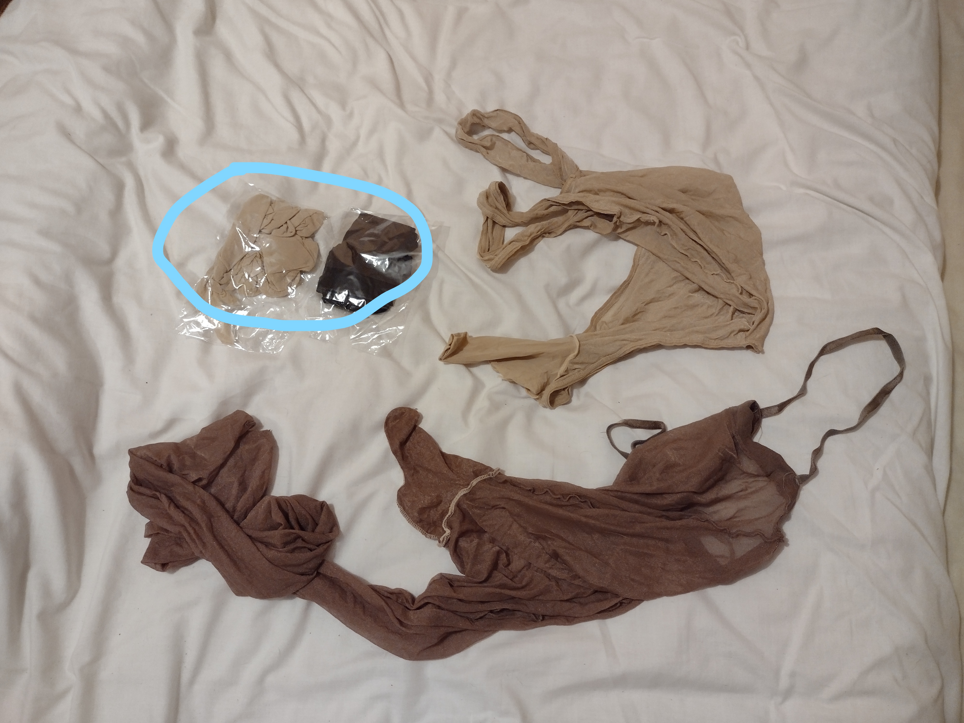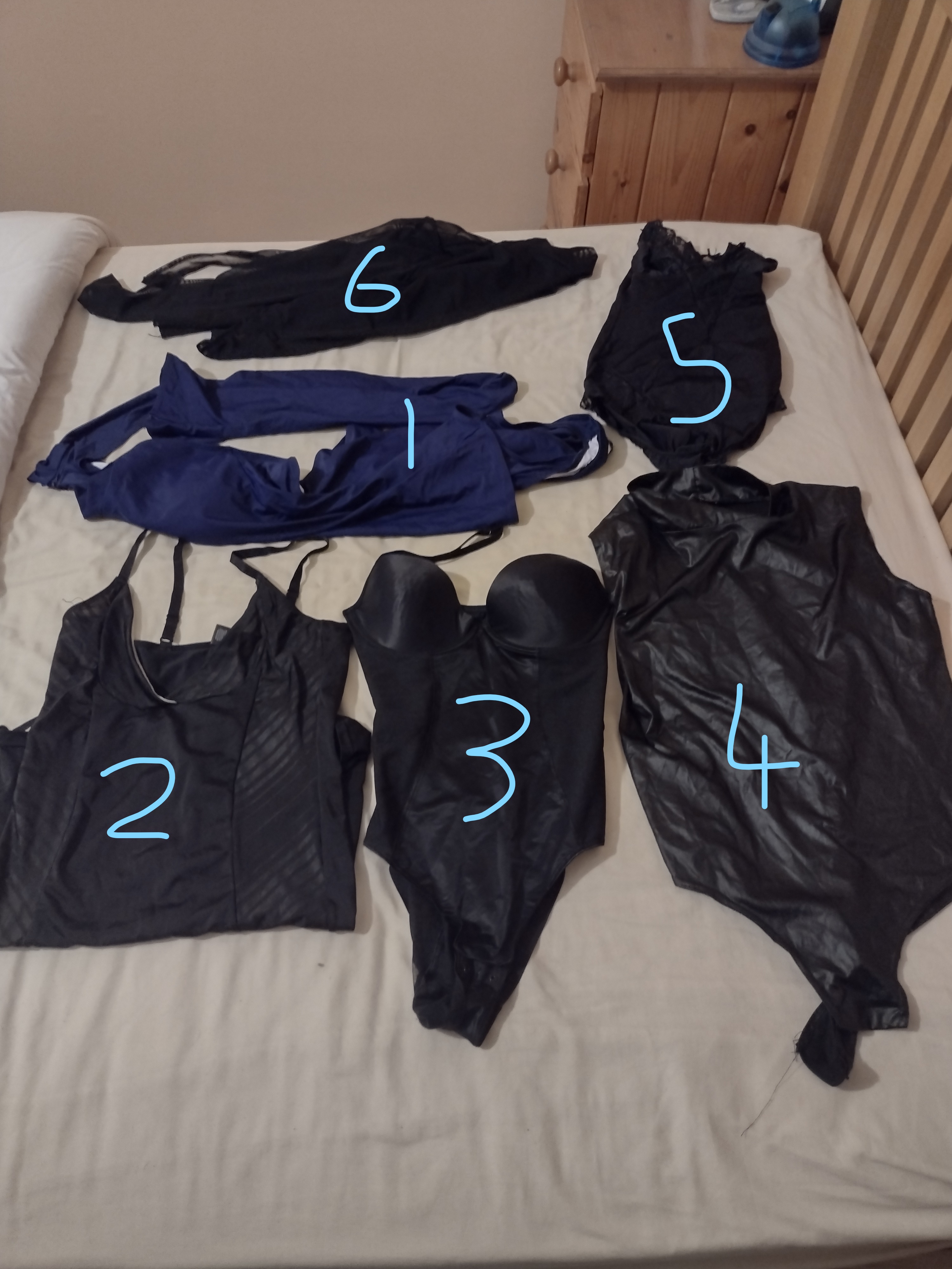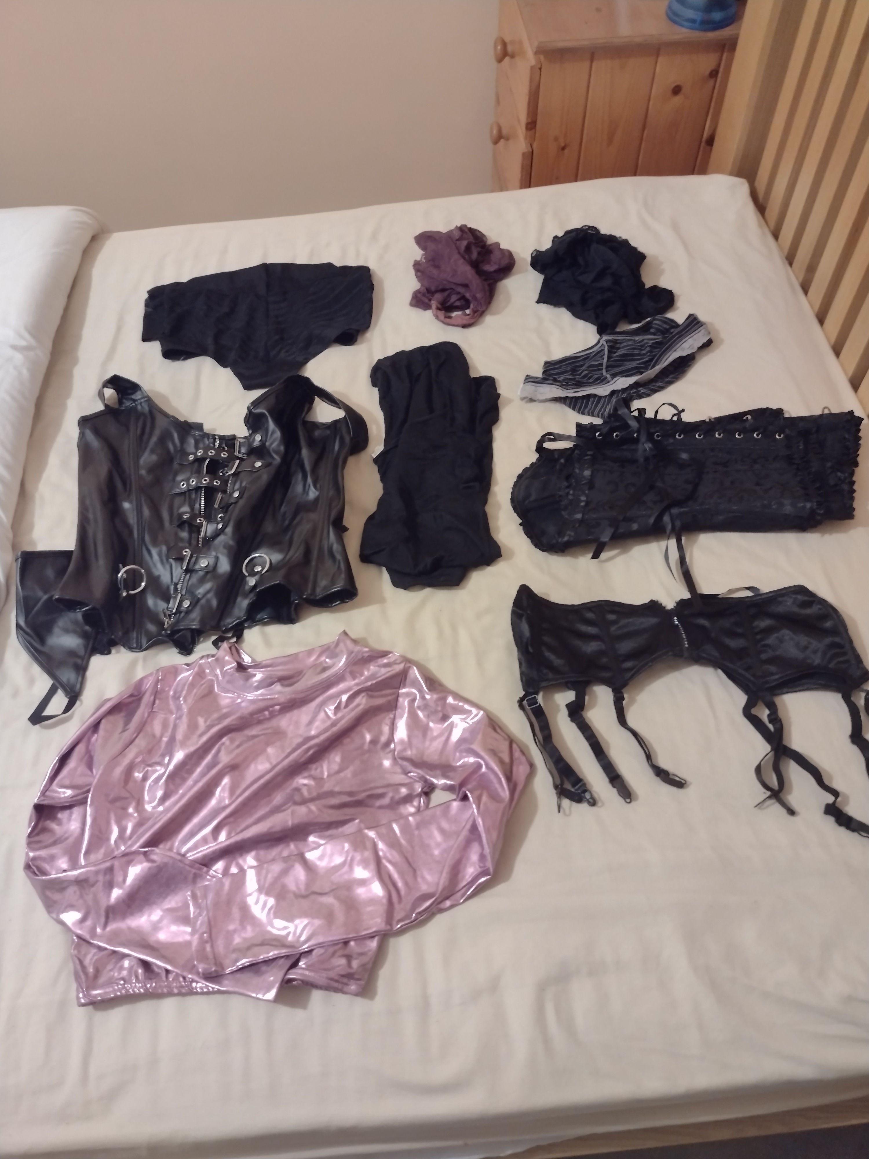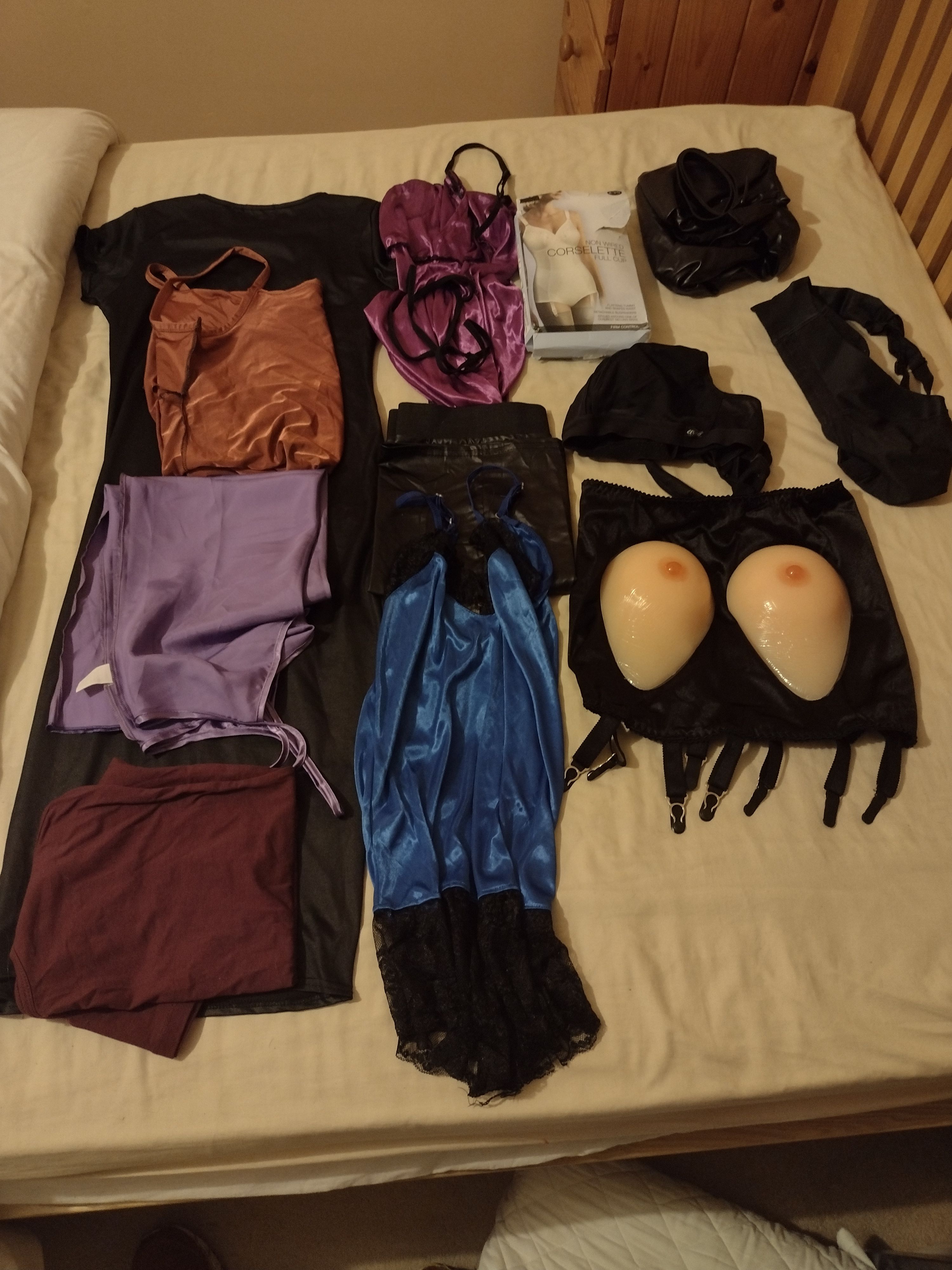 To be honest, I’d rather forget the last 2 years: the pandemic made any kinky fun virtually impossible (as opposed to the ‘virtual working’ many of us have been doing from home over the internet!). This time has not, however, been a total loss – I’ve been adding bits and pieces to my collection of naughty items, mostly as a result of interminable conference calls which led to me roaming around the internet and making a few (and be kind to me here) ‘impulse buys’, some of which I don’t now regret! As I’ve posted previously, my biggest challenges have been A) sneaking these new purchases past my GF without her getting suspicious and B) hiding them safely away in anticipation of C) a play day sometime soon. I think I’ve achieved A) and B), but C) is still somewhere in the future. What I did have the opportunity to do was to take stock of what I’ve got, re-pack everything in a neater manner (and not simply stuff things into the bag and hope the zips don’t burst!) and take some photos to share with you folks (spurred on by @Bound Whore) So here goes: My tights, stocking and knee-highs Some honourable mentions: 1. These are tights I use for my encasement sessions - 3 are new pairs, not yet tested, but look very durable and stretchy (a full review will follow) 2. My old favourites! Aristoc tights (no clue what type) buy so nice to wear. The left-hand pair have a ‘cock hole’ in the crotch, which occurred by happy chance and enables all sorts of fun things to go on! 3. My wet-look tights and stockings (with attached suspender straps) – love these when seeking a ‘different look’ for my play time. Let’s talk pantyhose bodysuits! 1. and 2. My full body suits, with hood, feet, gloves and sheath – totally awesome to wear, but a real challenge to actually get into and zip closed on your own. 2 is the nicest next to the skin and for some reason the material really ‘clings’ when you wear it. 3 and 4. These are my oldest suits and show it! No gloves or hood and open crotch in design, they are looking a bit ‘tatty’ these days and tend to be relegated to sessions when I thing things could get messy or rough (or both) and I don’t want to risk ruining nicer suits. The rest are also hood and gloves-less models, but have sheaths. They are also, generally, of a heavier denier (60-100) and I love to use them when I need to have clear vision (very difficult through the hooded ones) whilst still being dressed to some degree New nylon purchases Two new nylon bodies, with sheaths, and not yet tested ‘in action’ (another full review when I do) one is, essentially, a pair of tights with shoulder straps and the other a leotard style. I’ve circled two pairs of long nylon gloves, which I brought to help with some planned encasement sessions (another to have a full review when time permits) Lovely leotards 1.My ‘single glove’ leotard. Great fun and possible to get into on your own (also slightly too easy to get out of!), slightly on the small side and every time I use it there is a fear of ripping the ‘single glove’ arrangement. 2. Actually a ‘control-top’ type vest, which doubles as a very short dress – very naughty to wear. 3. simple body, but sooo tight! One to wear when I’m feeling the need to hold things in place, but only suitable for shorter sessions. 4. High-necked – I so wanted this to fit, but the crotch length is just too short! I can close it, but the ‘poppers’ pop very easily. I tend to use this more as a ‘top’ then as a body. 5. An old friend – had this for years and years. Repaired many times and I’ve been tempted to throw away a few times, but can’t bring myself to do it - Sentimental old fool that I am! 6 a mesh leotard – another new purchase and not yet tested in action. I like the feel of it and the high-neck is a sure-fire winner for my tastes. En-Femme An assortment of my more ‘impulsive’ buys made when in a more feminine mood. The black body-con dress is a sure-fire winner, whereas the PVC ‘skater’ dress is a big disappointment and destined for the next clothing donations bag (I wonder what they’ll make of it?) I’ve not yet tried the grater belt or corselette, or many of the other tops on display. Oh, and not forgetting my silicon ‘boobs’ – something I’d never have brought until some posts on this forum and how glad I am that I did! Zentai and a broken leotard The beige/nude Zentai has gloves, hood and sheath, making it both fun to wear and a nice ‘base’ for other outfits. The blue one doesn’t have a hood, but is high-necked and was so cheap I had to try it (supposedly a ‘hero’ costume, not sure who!) The black leotard is in urgent need of repair as I love it, but the zipper is broken. Long sleeves, sheath and high neck meant this was a joy to wear and it will see action again! Mostly corsets Considering I’m late to corsets my collection is somewhat limited, but I really enjoy wearing them. The pink top is another impulse buy and has yet to be worn, so no comments yet. I seem to have an alarming collection of knickers, not sure how that happened! Mostly to achieve a ‘look’ in some of my scenes, though I do occasionally get the urge to use them more ‘creatively’ when I’m in the mood for serious ‘MMmmppphhhhing’. Top left is a pair of body shaping knickers I brought with the idea of holding things in place and/or away from my hands. Stupidly I brought them at least one size too large, but they’re still quite fun. Hoods, gags, shoes and rope No need to describe these in too much detail as the picture says it all. Bottom left are my rope ratchets and ice-release bag, the essentials for self-bondage. The rope is only a small sample of my collection, lots more lurk in another hiding place. My favourite head-gear is the hood, with penis gag and blindfold – very intense when buckled tight and locked in place. Stuffing and sundries I bet your eyes went straight to the plugs!