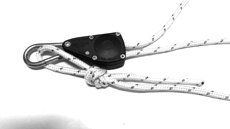 Then the rope ratchet. It's just one from Gamma, it can hold 150 pounds according to the specs but I can lift way more than that and it hasn't slipped once. I made a loop in the rope and tied the end to the carabiner, once it's in the tube it will be out of reach.