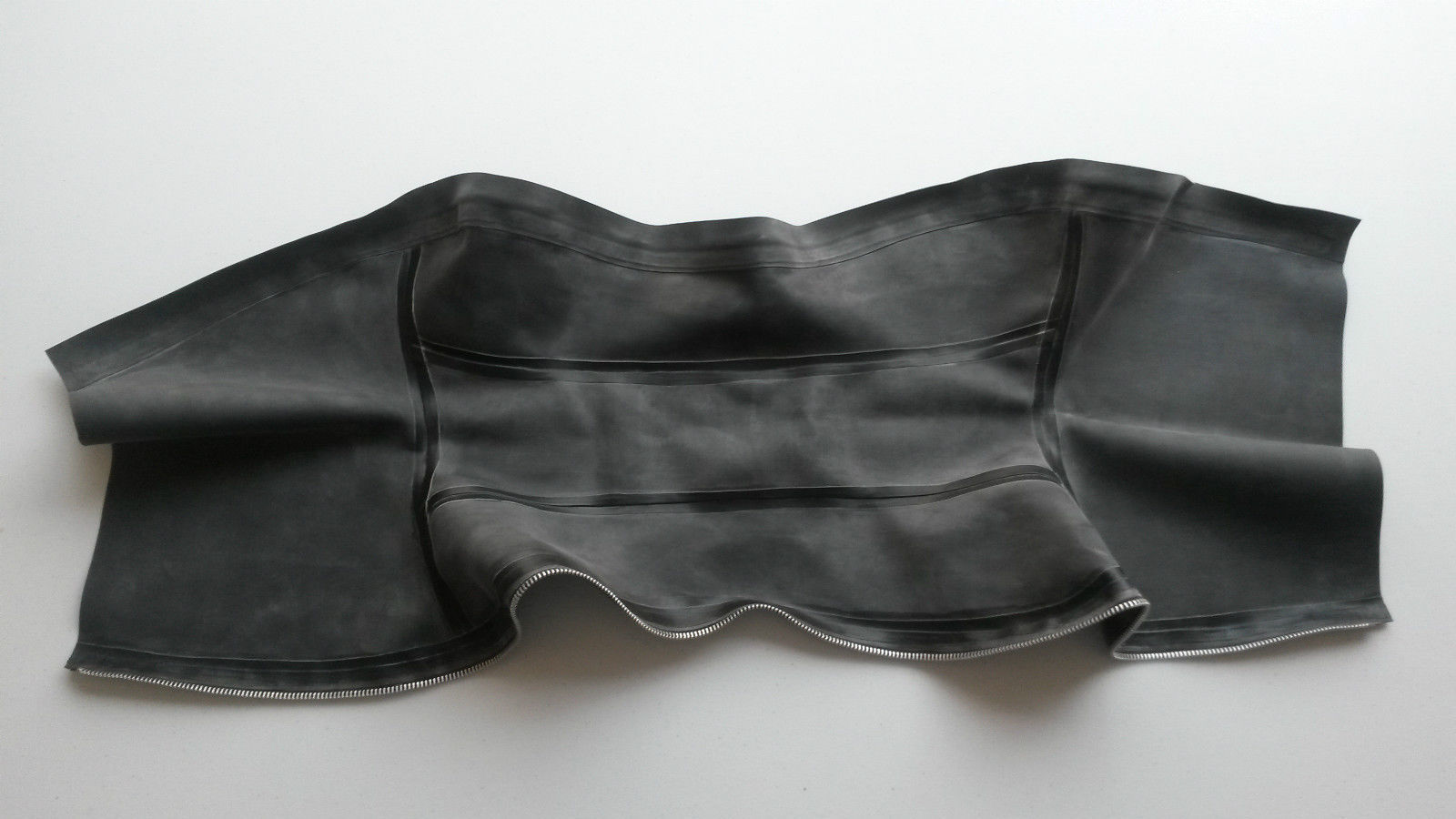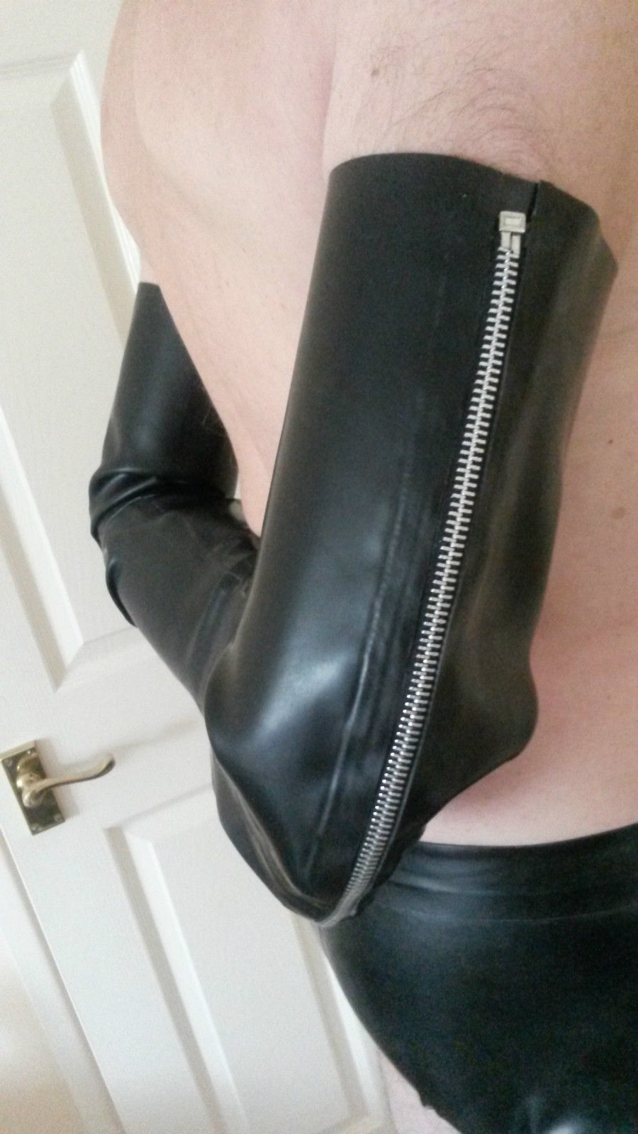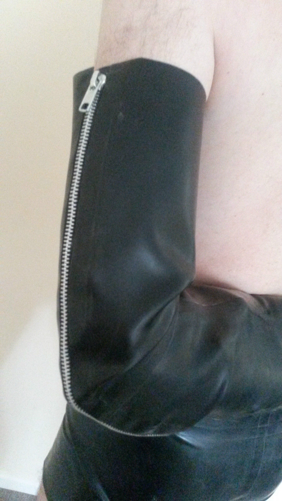 It is a Japanese style Boxtie Latex Armbinder, which is made like a Bag with two openings for the upper arms. The idea is to slip in with your upper arms and cross them on your back. Then the air can be sucked out, to make a Vacuum.
