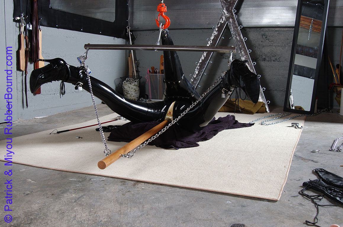 3. Latex clad, suspended spread legs and violated: My GF has had enough of my binding her and has turned the tables. I don’t know where she found the money for the latex suit or the single-arm, but I don’t care. She’s left me like this with the dildo up my ass as a lesson for all the devious things I’ve done to her. She says I must make myself cum before she will free me. My only hope is to use the dildo but I’m already exhausted…
