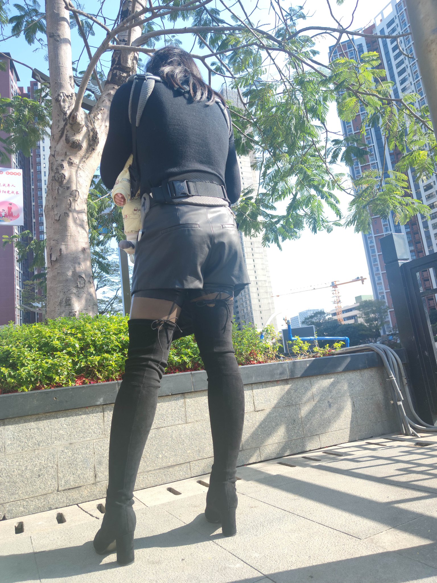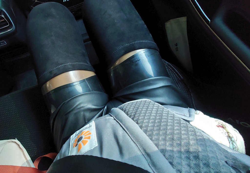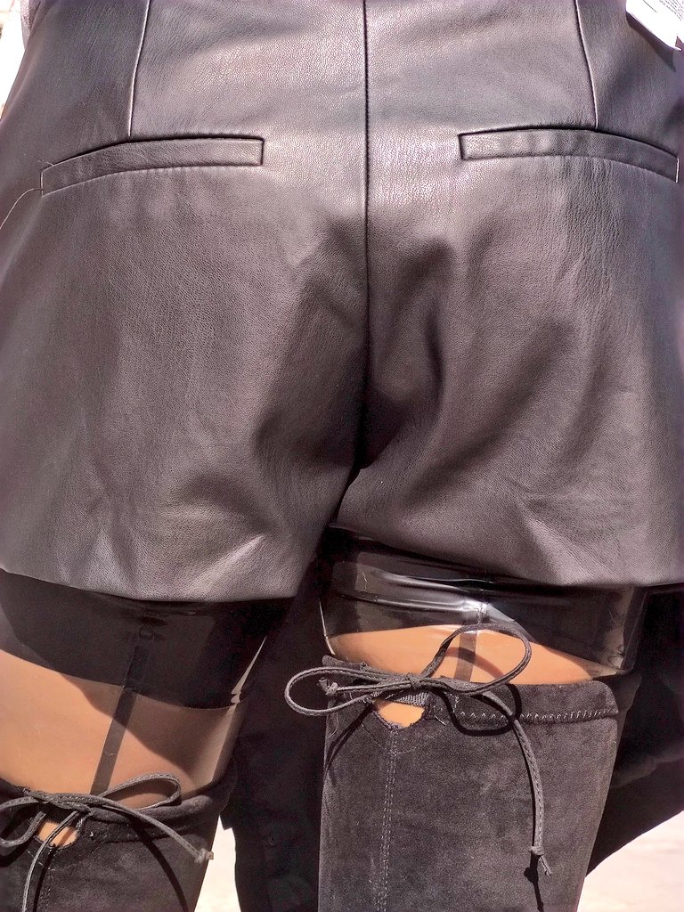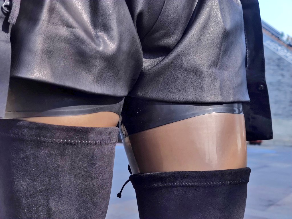 How to wear transparent back-seamed latex stockings with latex shorts in public: