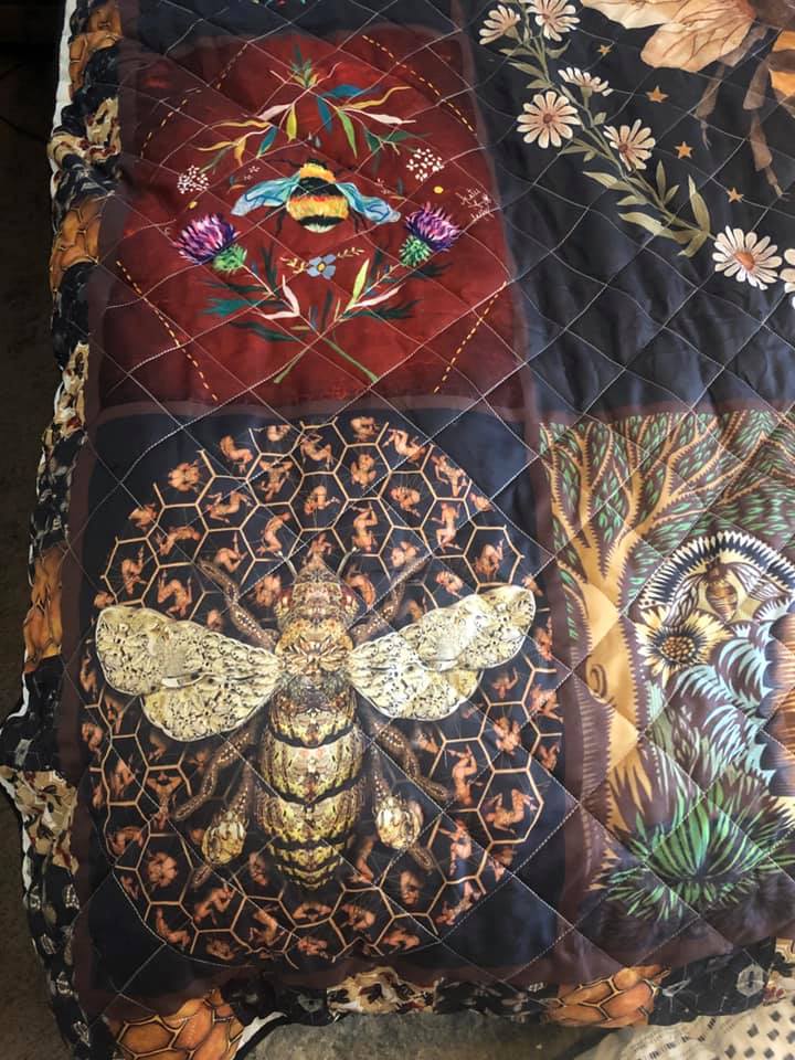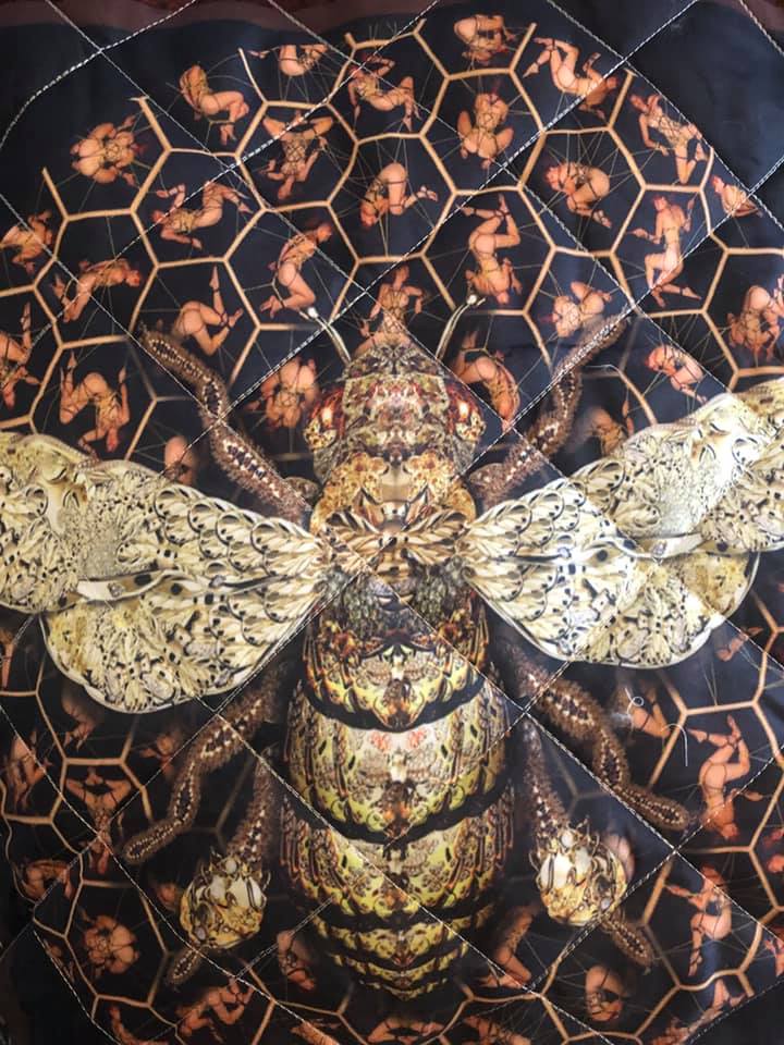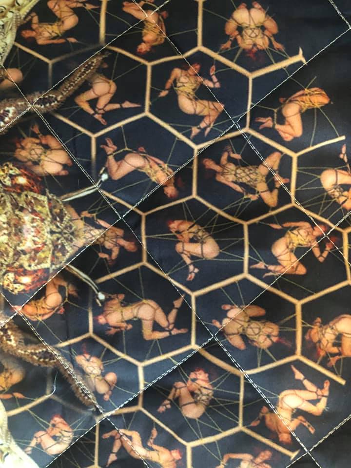 I stumbled on this in a buy/sell forum. Someone bought this and it wasn't what they expected. They wanted something to use on family outings, picnics etc but this was far from that. If you don't look too close, it just looks like a blanket with bees on it but if you look closely, you can see that some of the art on this blanket is made from rope bondage images.