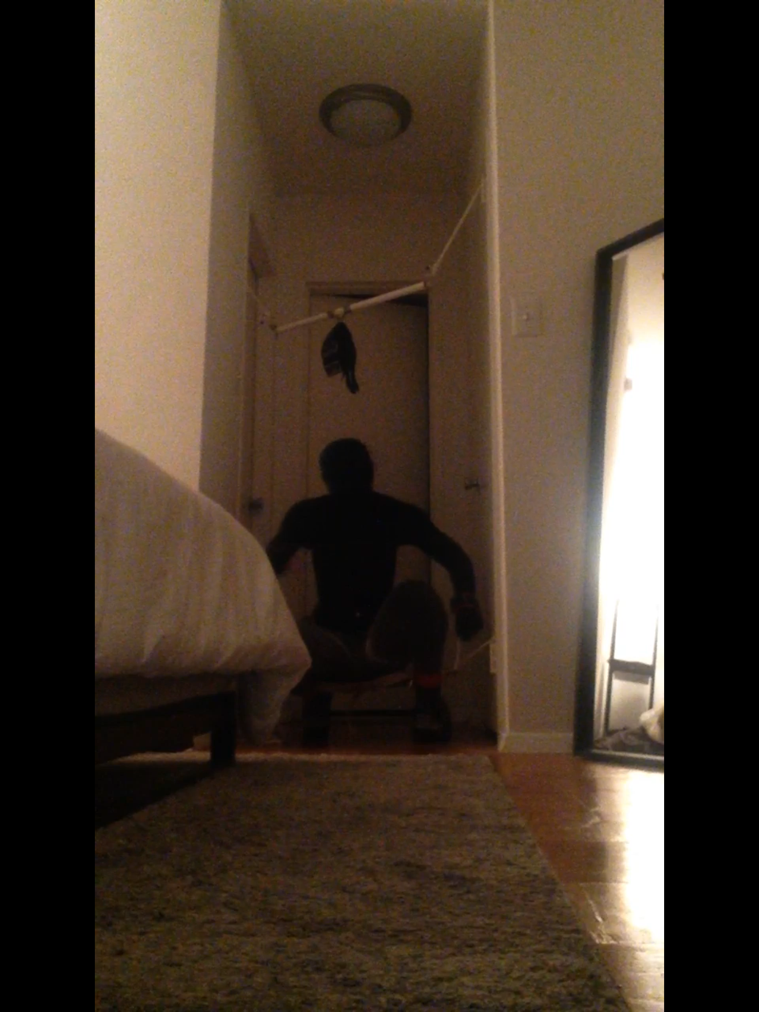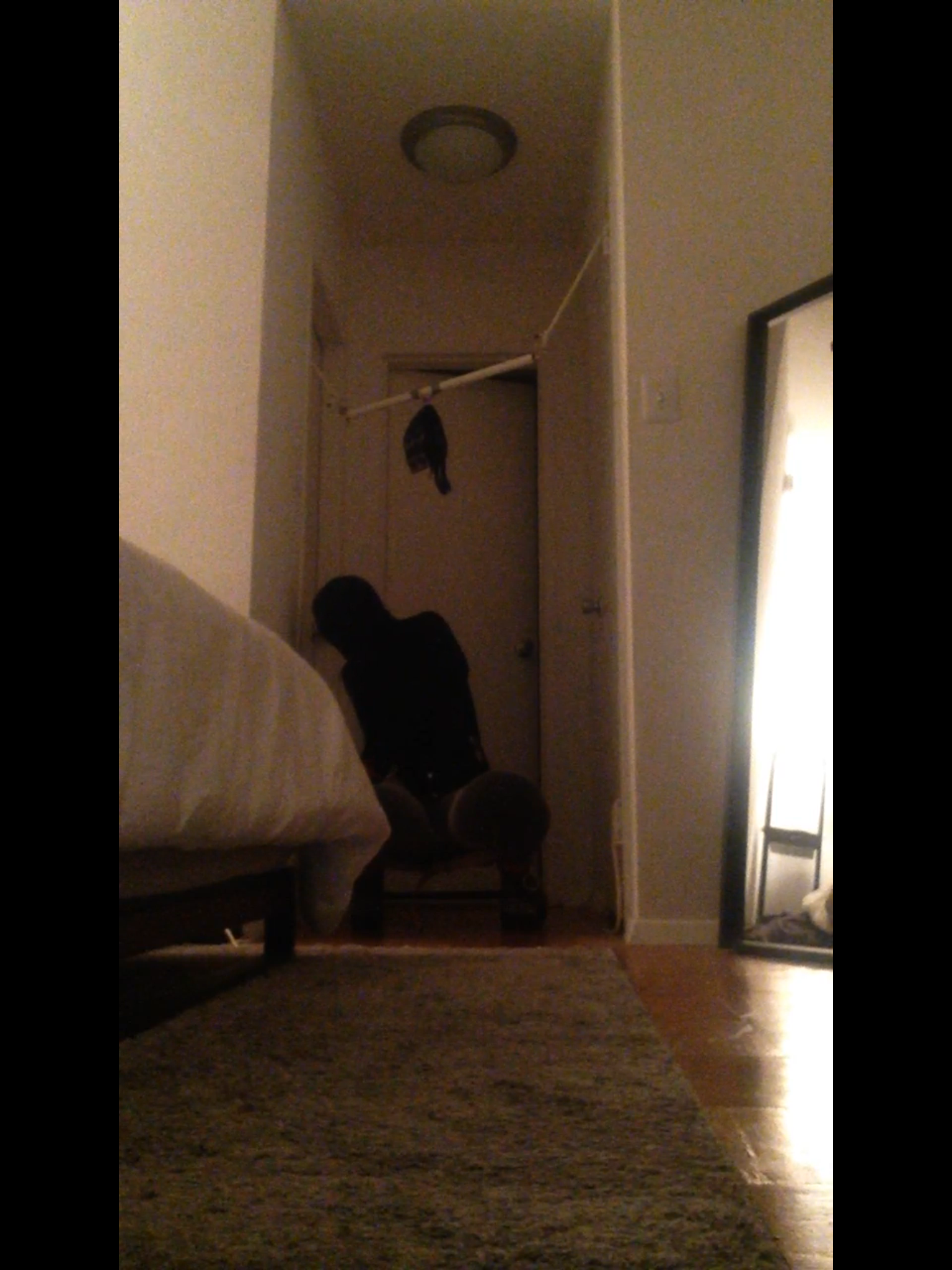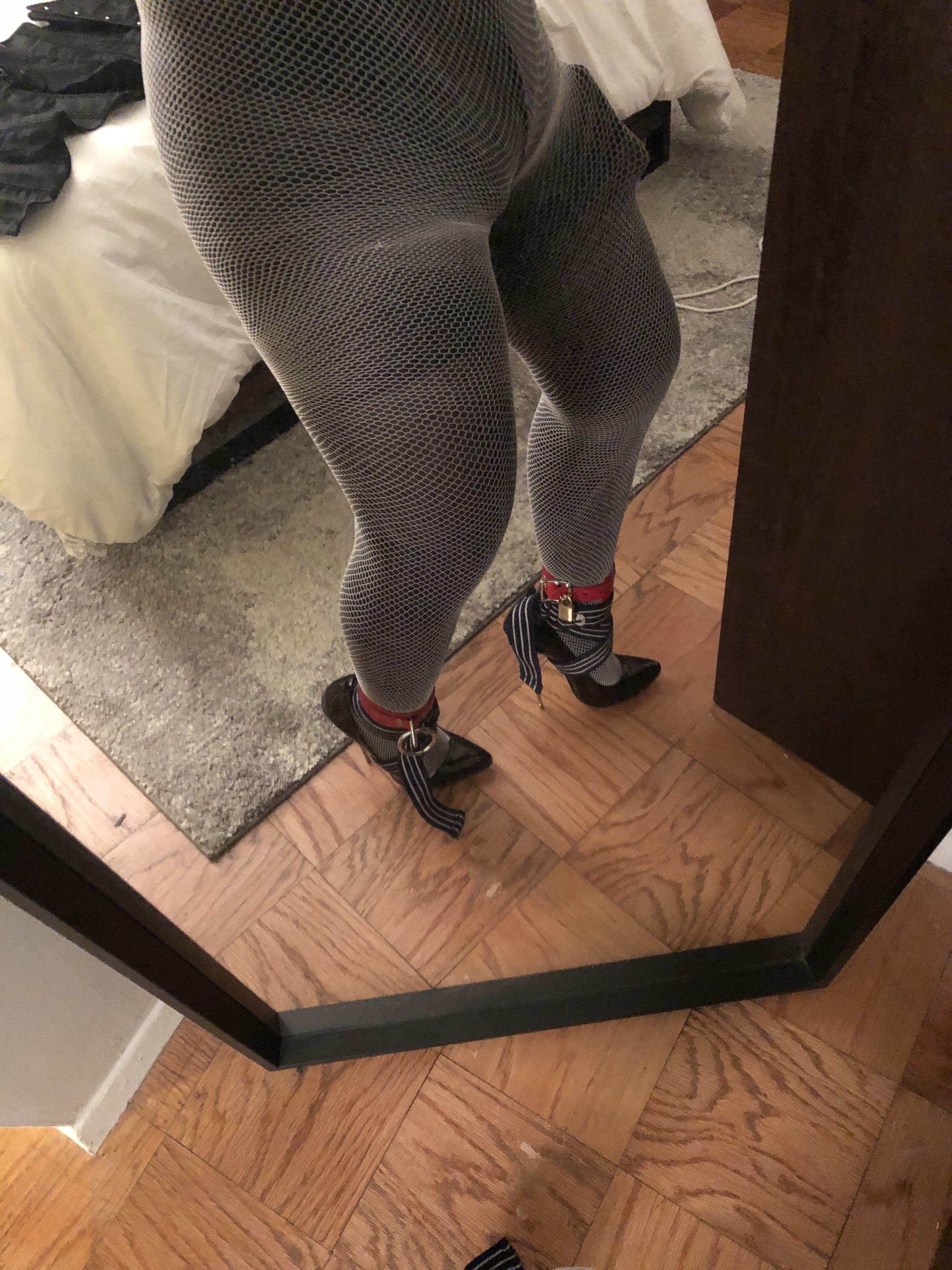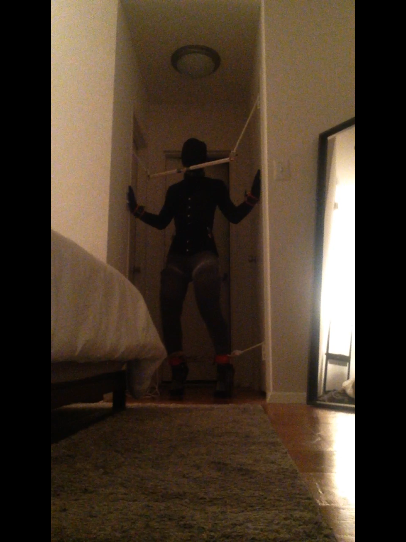 So I decided I wanted to do another forced high heel standing session. This time I used a pvc pipe and chain attached to my collar as a yoke. Tide that to the top of the doors and ankles to opposite doors. I could have let my self out whenever I wanted but as some of you know I have a large window in my place. I had placed the keys to the locks right in front of the window. I also added obstacles like chairs and bags to slow me down.