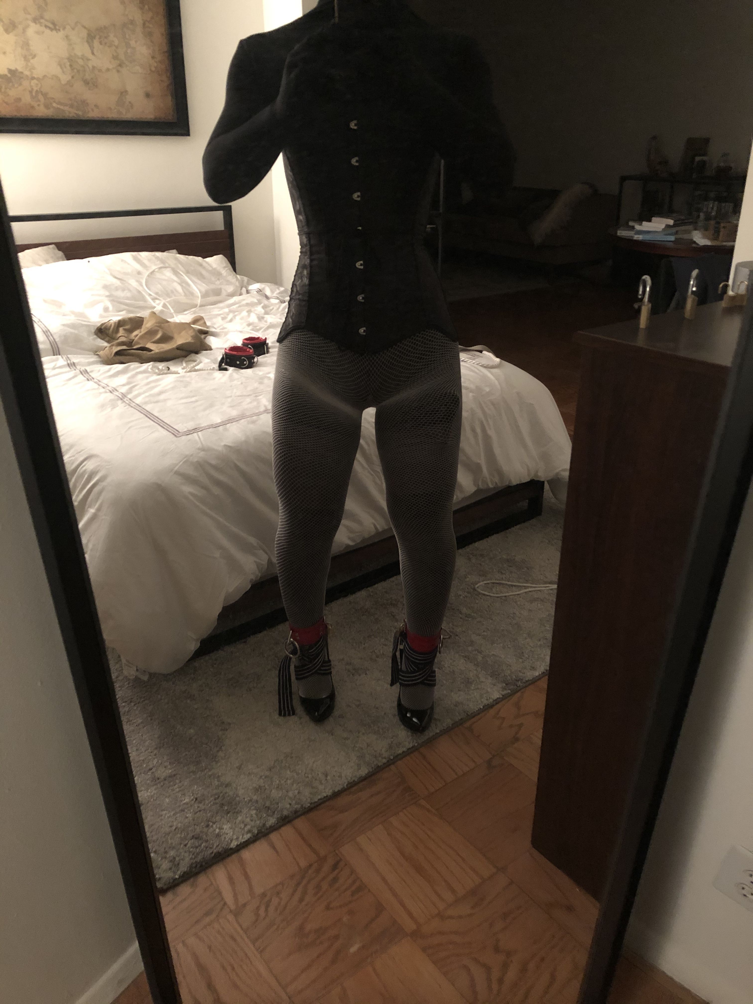 I got dressed in my usual layer attire but with a new tighter corset. I also used the tallest heels next to the ballet boots so I could spend some time tied up. In all I was bound standing fo 25 min before the vibrator got the best of me. If not for that I could have stood here at least an hour but would have gotten bored. Hope you like the pictures. Let me know of any suggestions stor future dares.
