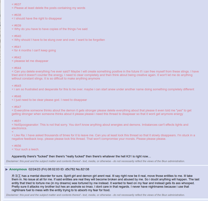(24 Feb 2023, 21:34 )emyy Wrote:(24 Feb 2023, 08:08 )DSM666PDW Wrote: If this whole kei thing is legit, why not just ward off these spirits or whatever they were. And then pawn them off on someone else. Ill take them in. Bring it on. Said entities will become my toys. Yeah I'm not going to talk about it much but some weird stuff happened these last few days to me too... (24 Feb 2023, 21:34 )emyy Wrote: the last three days have been fucked. (24 Feb 2023, 23:09 )littlewolfstar Wrote: these last few daysNew Moon on Feb 20? Or the last occult mass against Putin on Feb 21?