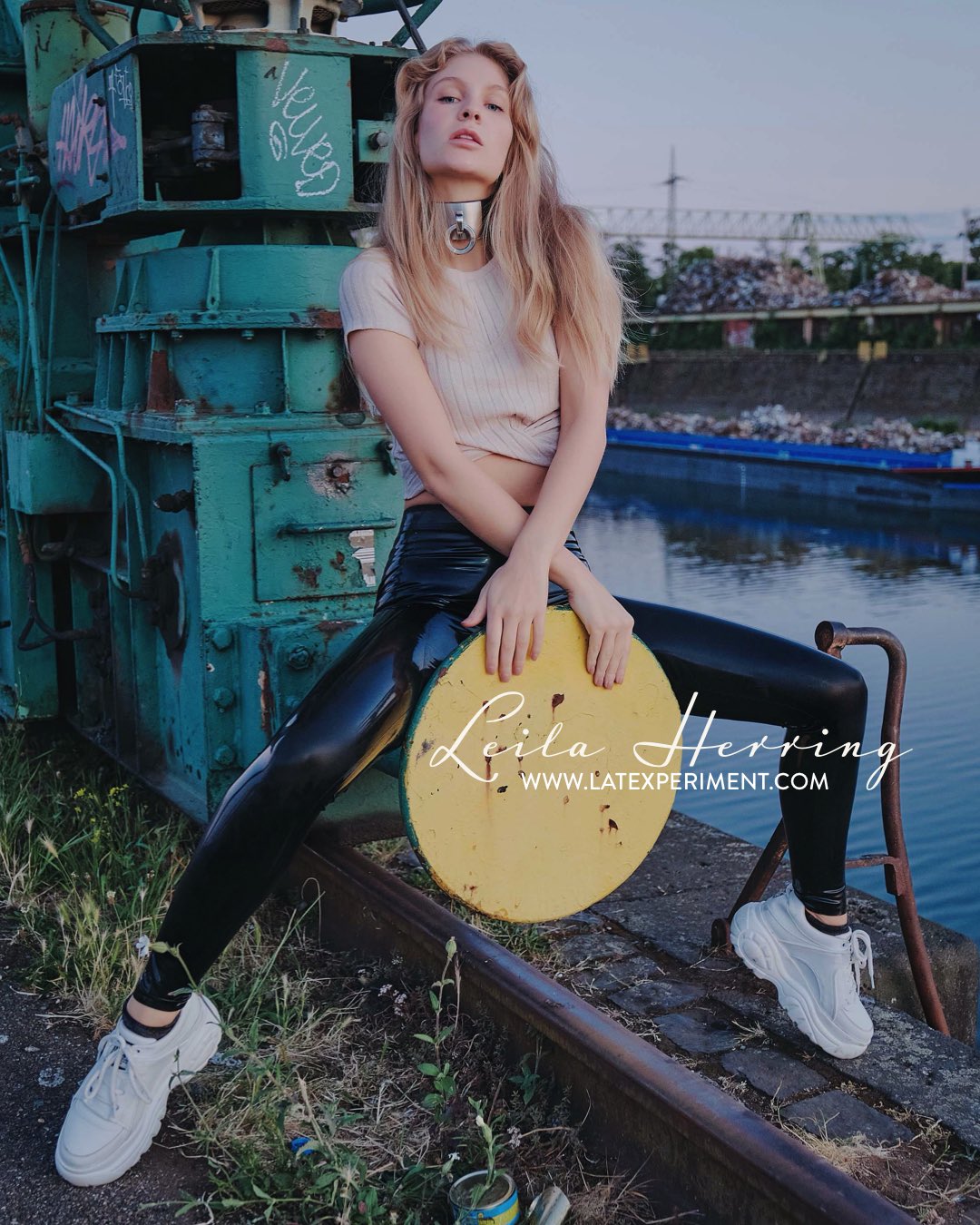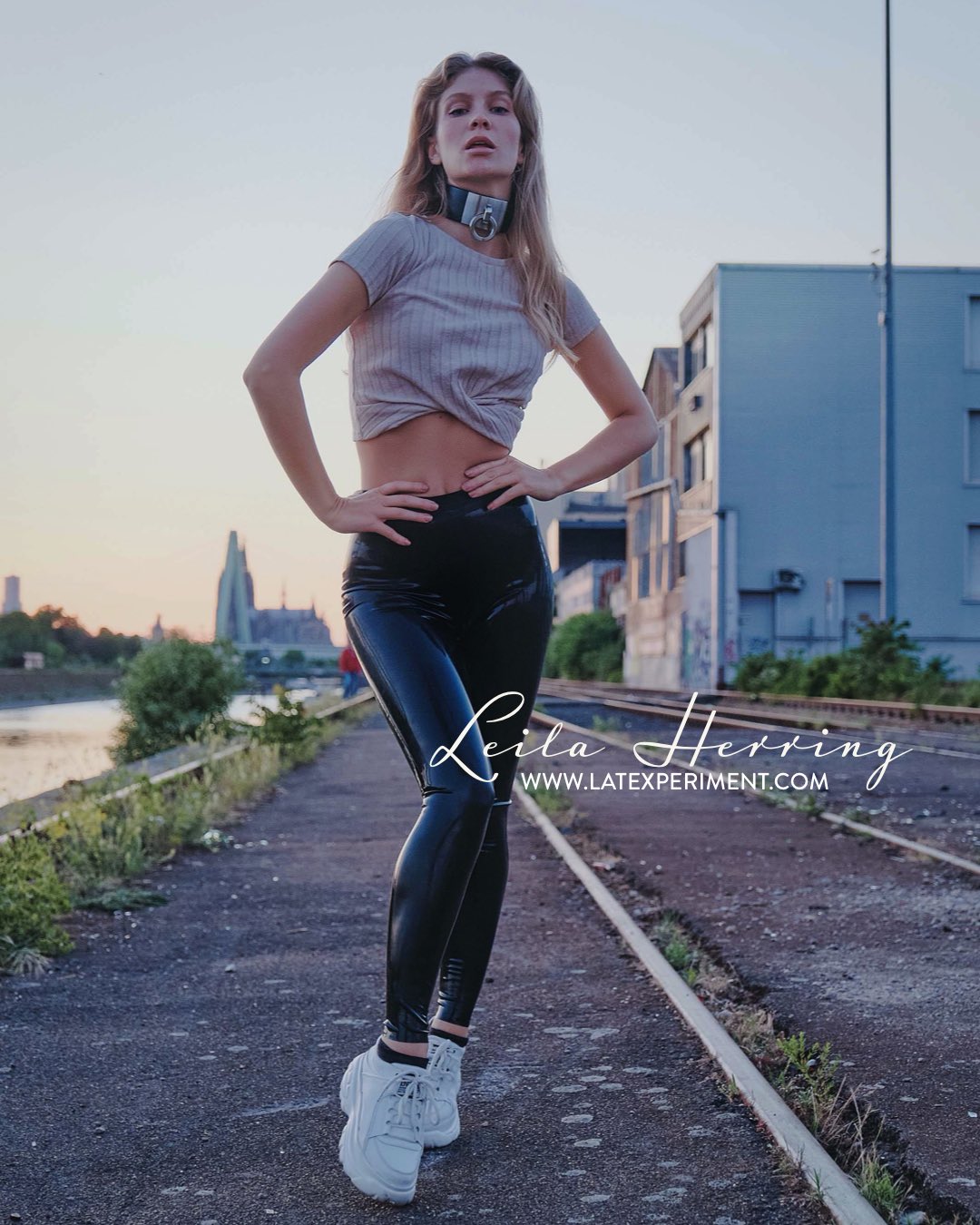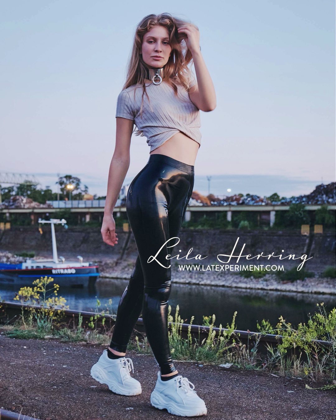 Not quite candid, but it looks like a normal street fashion. What can be more usual, than latex leggings?