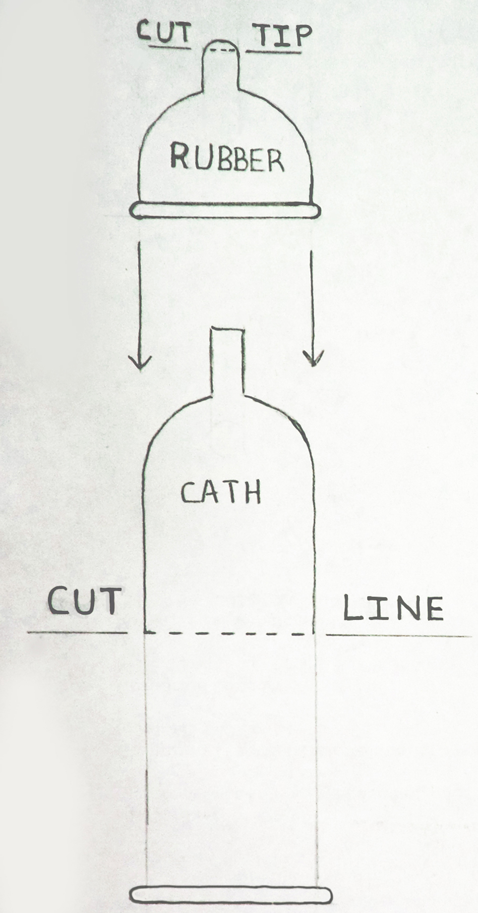 As an alternative, some caths have an inner flap designed to fit behind the penis head for an added layer to deter leakage. It is possible with some engineering and ingenuity to make your own.  This method is a more involved and involves gluing a balloon to the inside of the cath to create the seal. You will need to find a proper sized balloon (one that will fit inside the cath head as well as your member head) and also make a small hole in the balloon tip roughly the size of the cath tube. Cut the end of the balloon with the bead (this is the beaded stem where one would blow up the balloon that is far too small and constrictive) which is why it needs to be trimmed. This cut should be made a bit up the stem to allow use. The size will take some trial and error to get the right size and obviously not too small. It is possible to make a new “bead” with this small bit at the end of the balloon and that will require experimentation. Such a bead will make it durable, stronger, more secure and create a better seal. This involves adding a bit of glue to the outside of the cut and carefully hand rolling it upon itself to create a small bead. Alternatively, using a cylindrical object a bit larger in diameter of the cut balloon stem, place the balloon stem outside the cylindrical form. Starting at the cut end, add a bit of rubber glue, roll this onto the stem to create the bead. Just a small bead as too much may become uncomfortable.