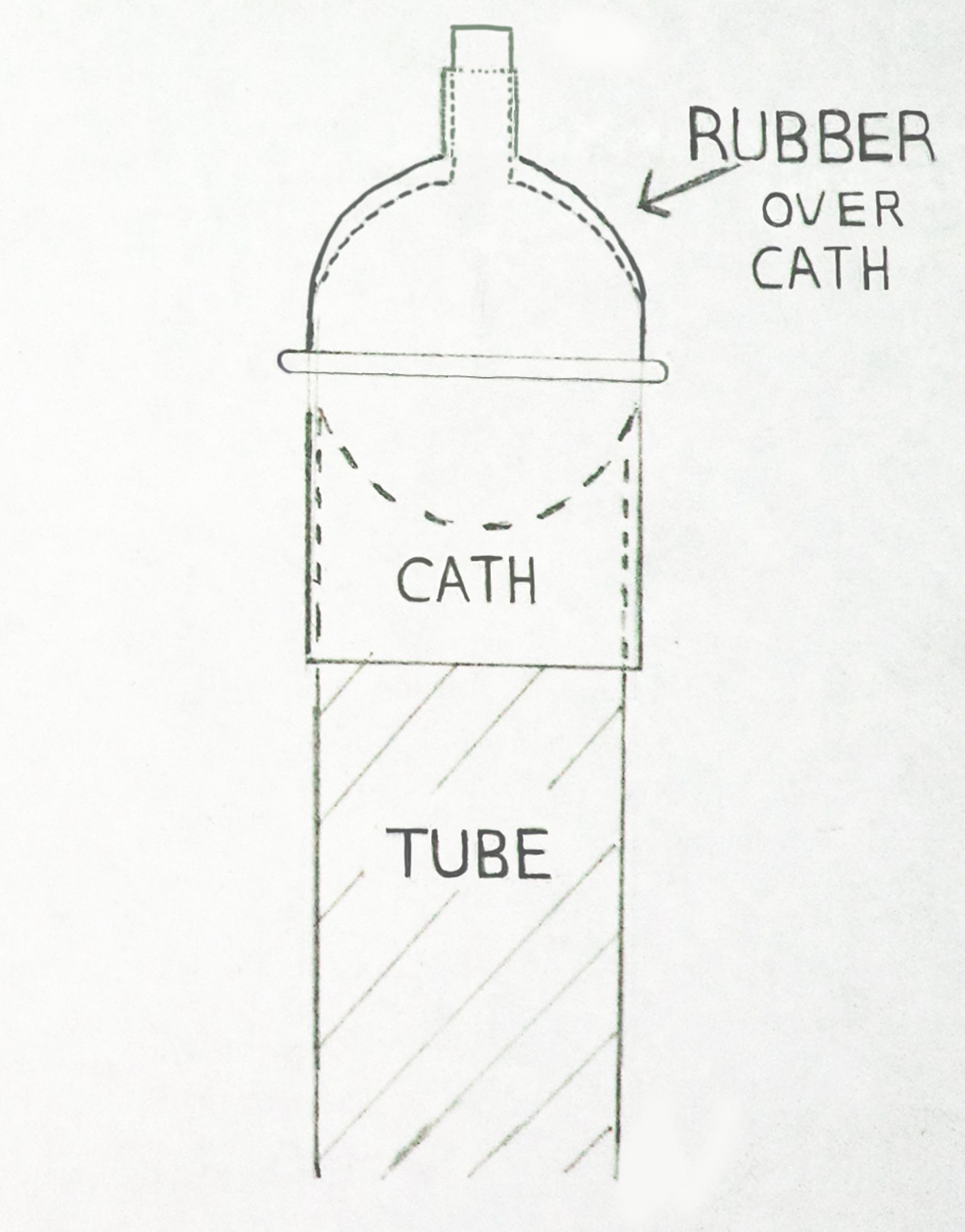 With self adhering Caths (those that have glue banding) one may simply roll the cath onto a rubber. (See Fig 1) First, cut the end of the rubber and roll it onto the tube down to a point below the top of the rube. At the cut point on the rubber, swab with isopropyl alcohol to remove any power residue or finger oils as a clean surface is a must. Allow enough room for the cath to make contact with the rubber close to where it was cut to avoid excess rubber as this will just end up being in the way. Usually with self adhering caths the glue will produce a secure bond that will be waterproof. Dust the mated piece to deter any of the cath adhesive that may still be exposed from sticking. Then roll the piece off of the tube. Then unroll entirely, place in a bag (a paper bag works well though a plastic one could work) with an amount of powder (cornstarch or talc) and shake to dust the entire surface, remove and turn inside out, place in bag and do this again. Now both sides should be coated (dusted). Remove and return the cath to the original side (it would still be inside out at this point) and hand roll it up to the original condition. Be gentle as not cause any rips or tears and do not worry about making this “tight.” Now place the device on the tube (dusting the tube will help) and carefully unroll pulling it slightly down the tube as you go to keep it tight and avoid any wrinkles. When at the end (unrolled the entire length) start at the beaded end of the rubber and roll back up to the original condition taking care to avoid any wrinkles. This is now ready for use.