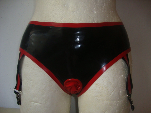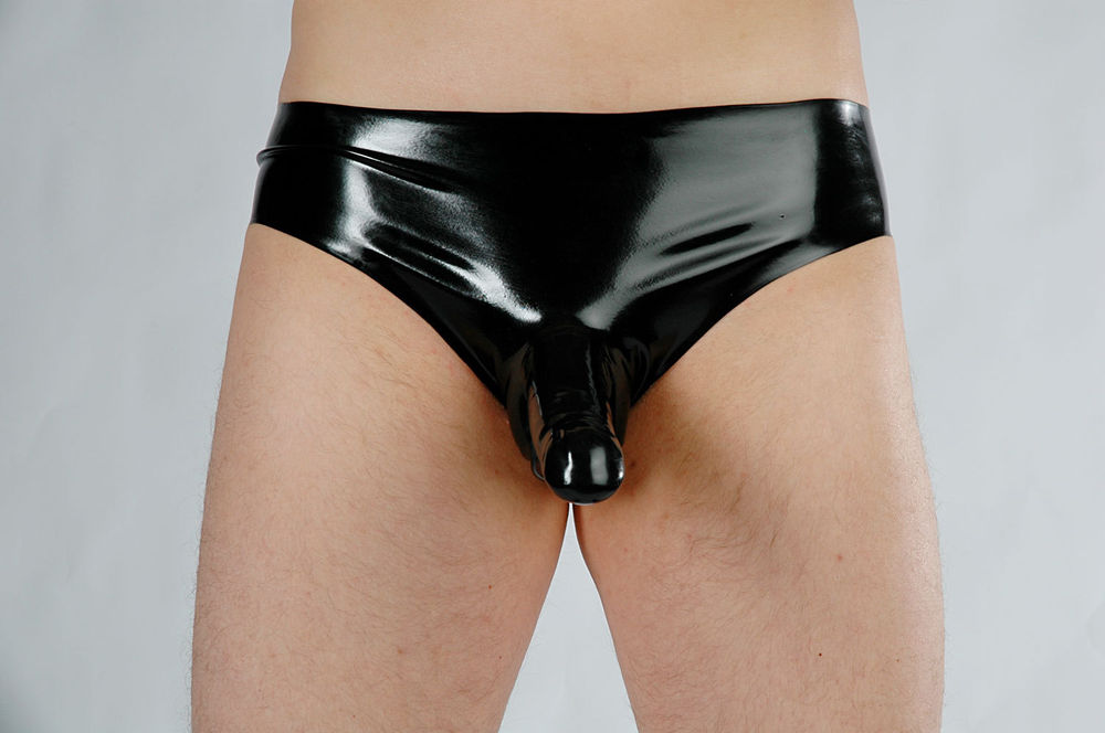 Since I received more questions about latex slips, pants, briefs with integrated condom or penis sheath. Or even with two condoms, or even strings with a penis sheath: