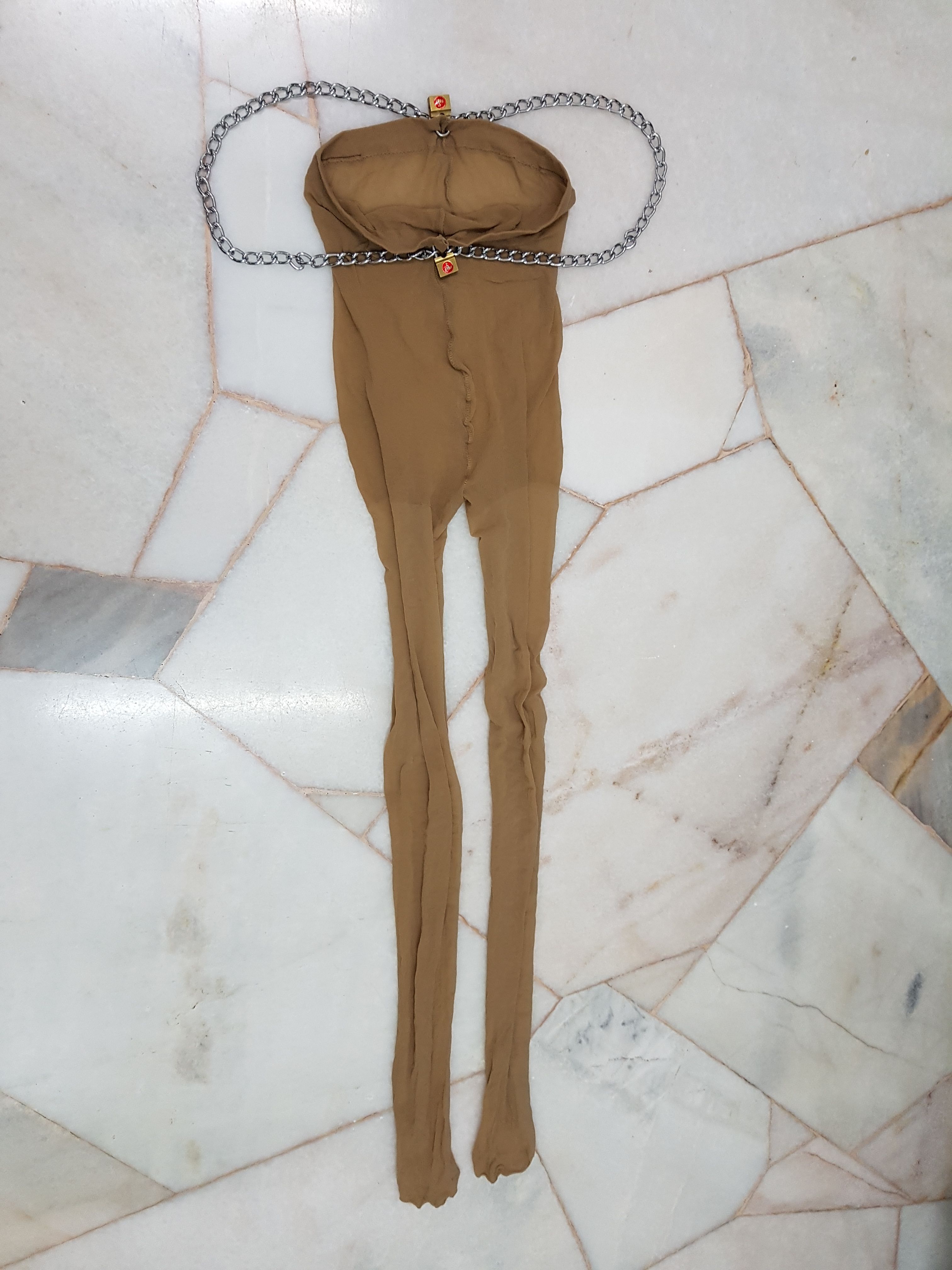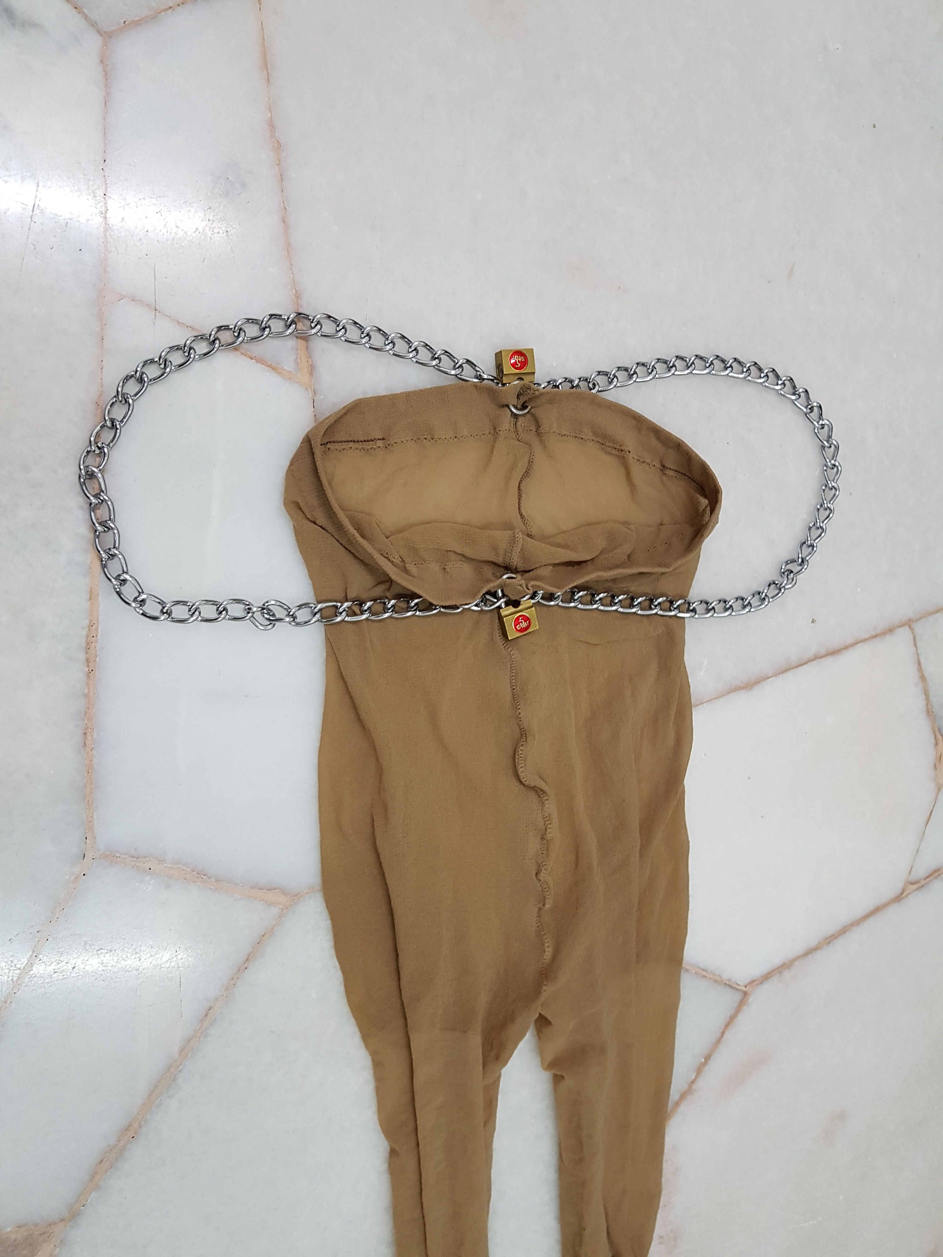 My idea is i make my belt(ordinary leather belt) padlocked with my pantyhose(the belt also padlocked)