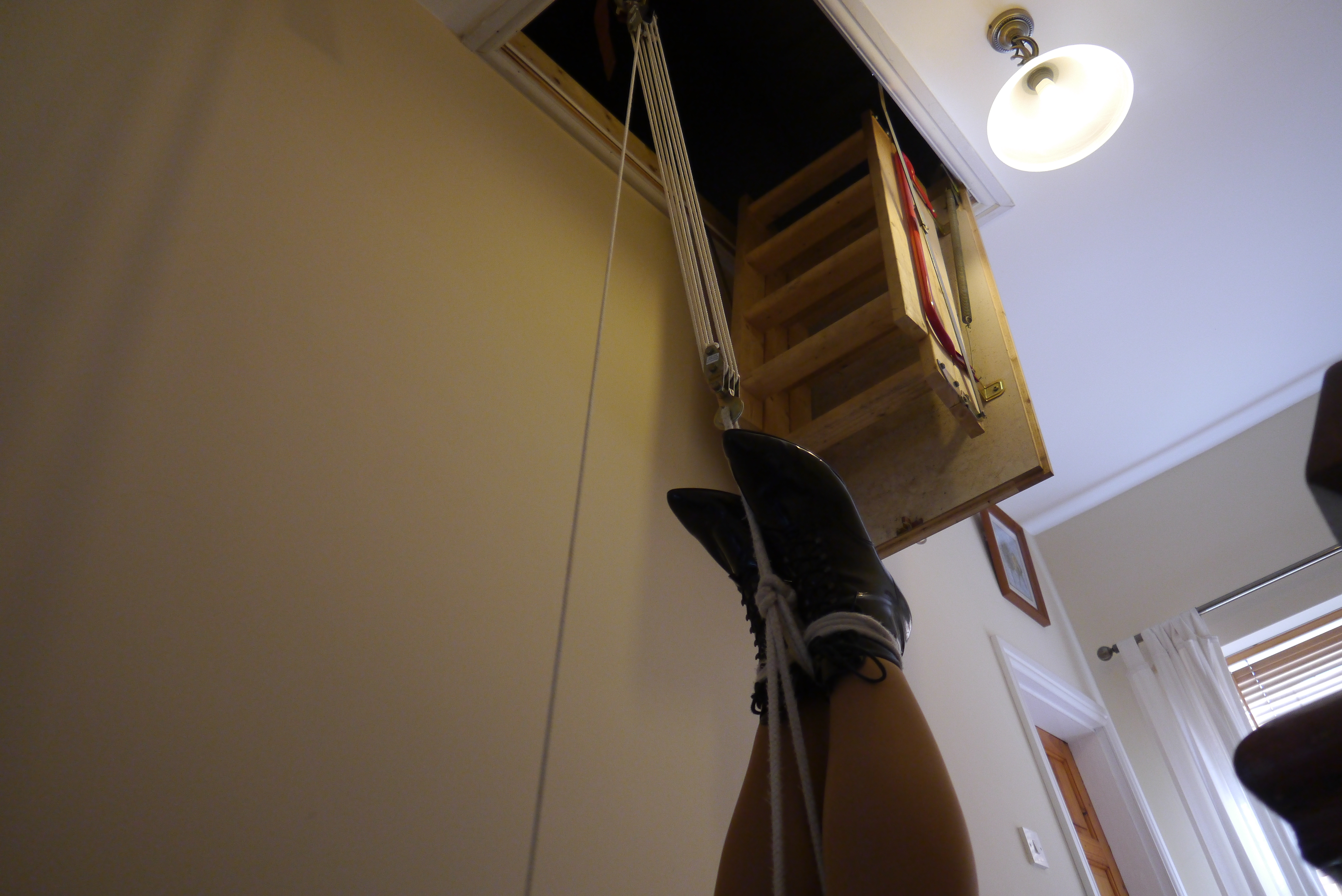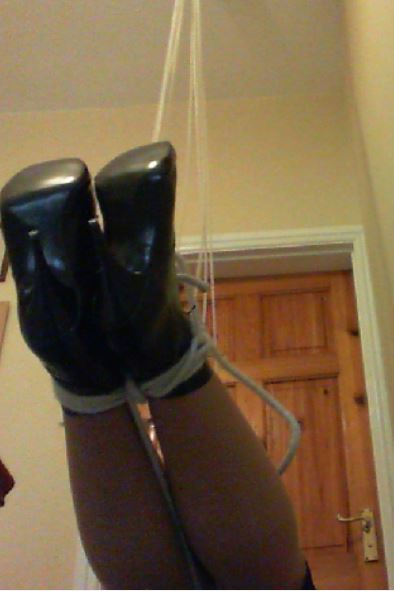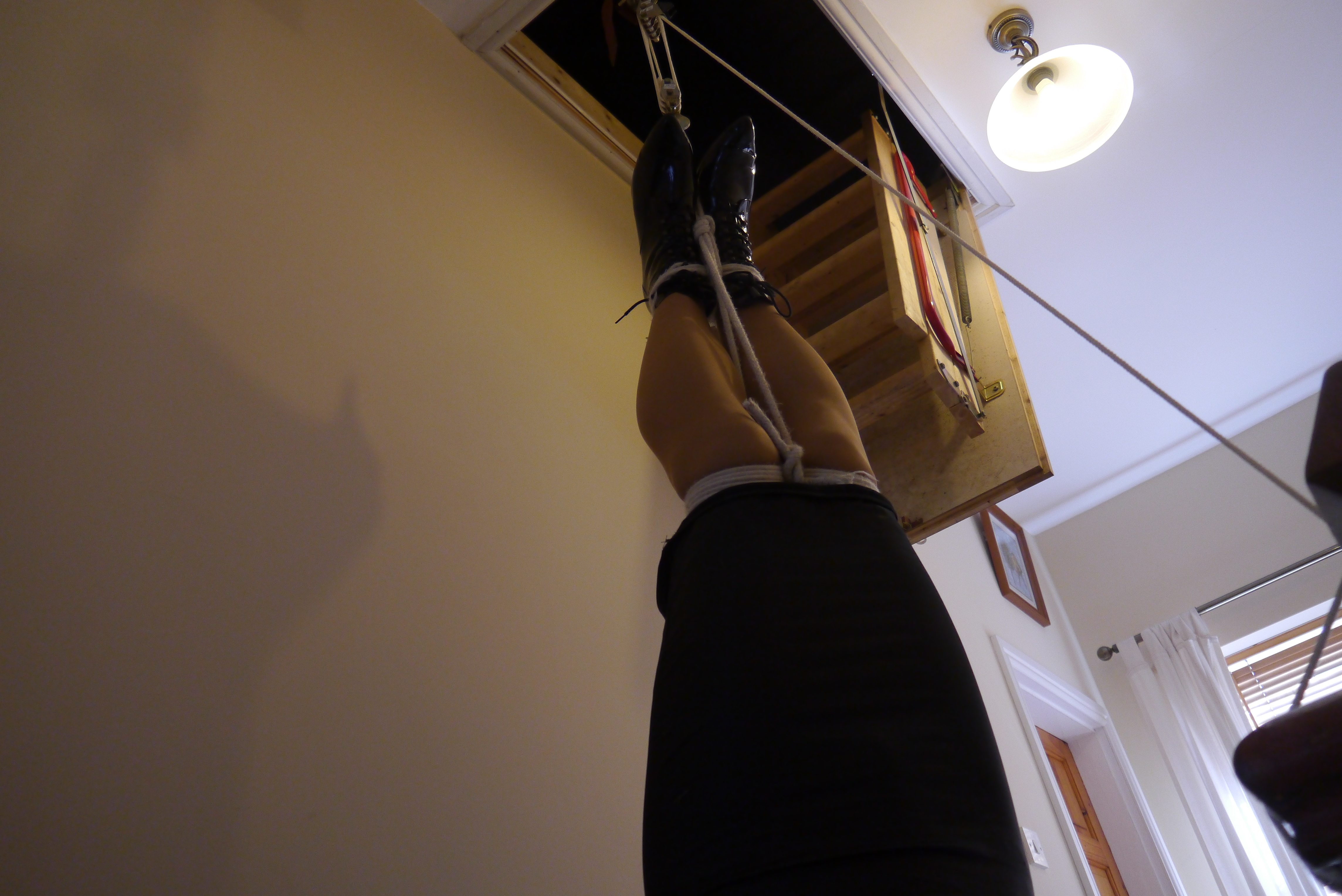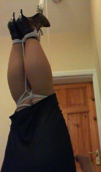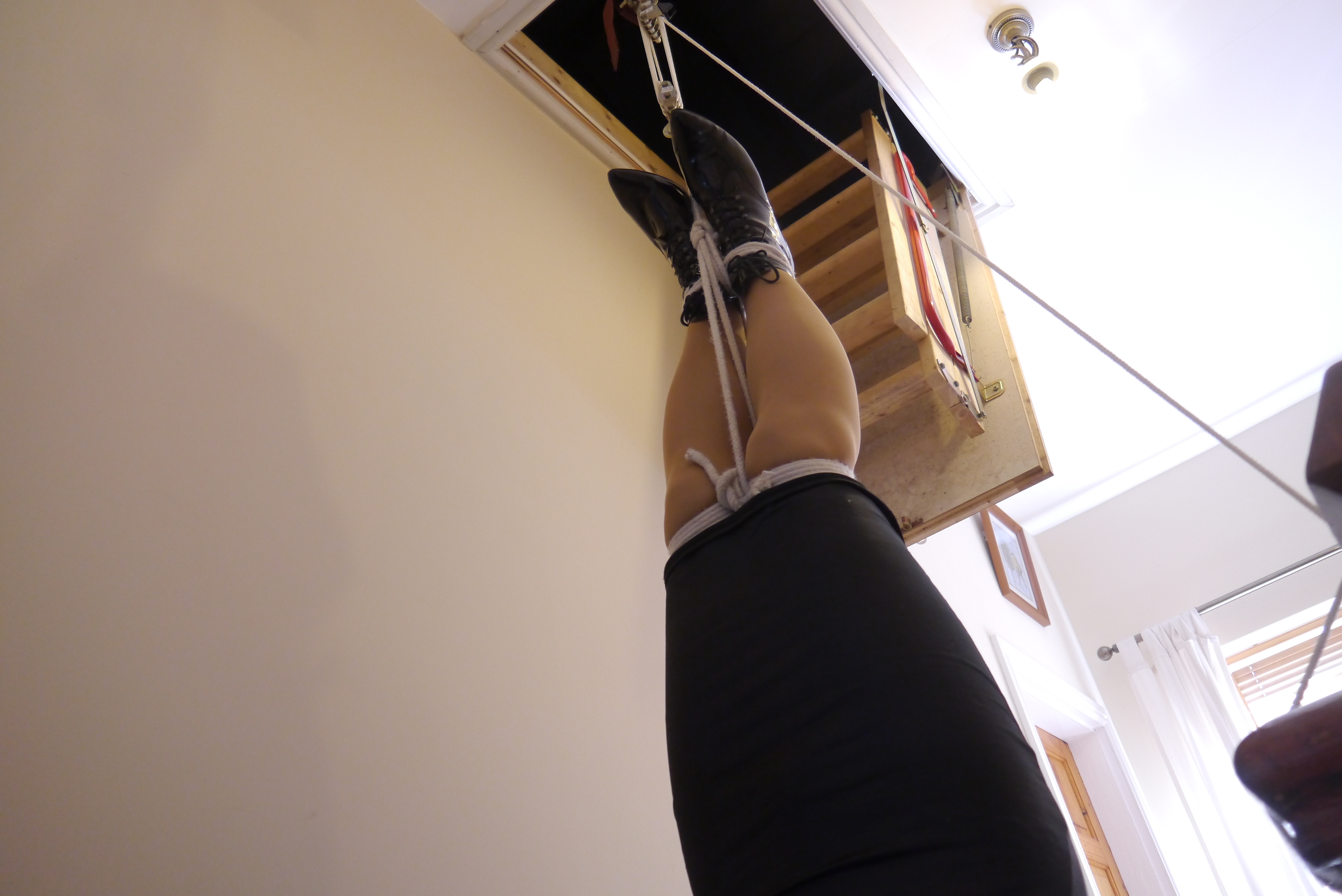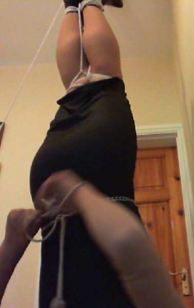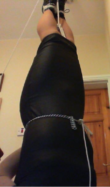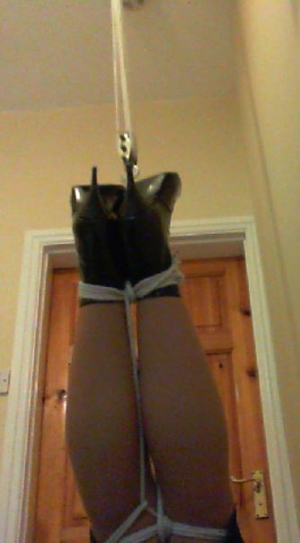 I looped a strong rope between the cinched bondage of my legs and securely tied it in place before attaching it to the hoist. Happy all was in order I pulled a couple of knee-highs over each arm to complete my encasement and I was ready to go.