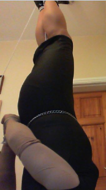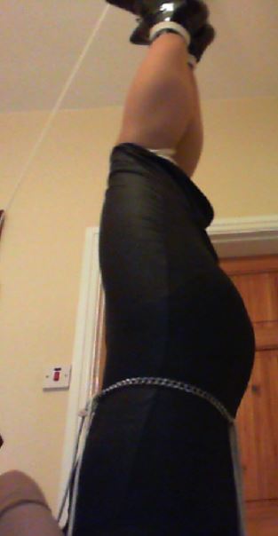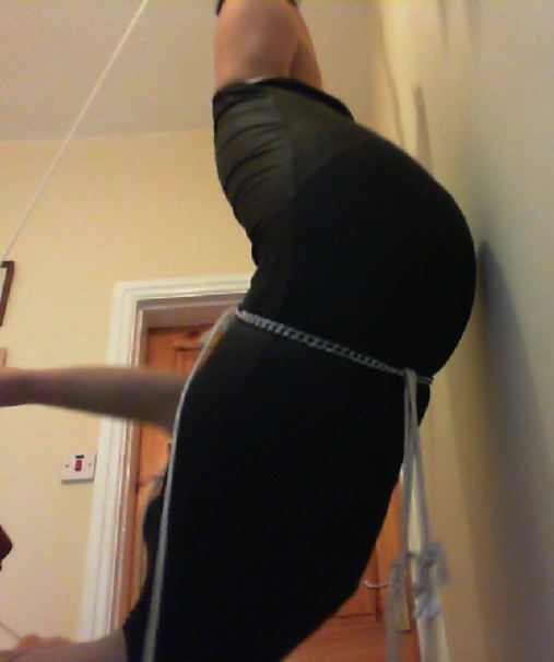 After freeing myself from my first session (MJ-SB01/2015 – Home alone session 1 on the bed) I took a brief break to drink some water, stretch out and do a little bit of work (how many of my colleges could imagine me typing those emails whilst plugged, gagged and dressed in my tights and Lycra?). For my suspension session I wanted to create a look and experience of a ‘damsel in distress’ so I slipped into a wonderfully clingy ‘body-con’ style dress in a wet-look finish (Though I love wearing some items of ‘feminine’ clothing I don’t go into the whole TV or cross-dressing area- no wigs or make-up and definitely no frilly knickers!)