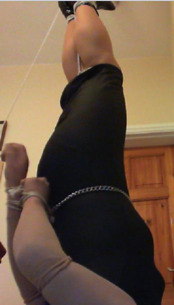 Taking a deep breath through my ball gagged mouth I started to pull on the hoisting rope. At first my legs lifted easily upwards, but as more of my weight came away from the floor the hoisting became more difficult.
