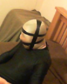 I’ve been looking for a new gag for some time and haven’t found what I wanted yet, so I decided to try something different. One knee-high went over my head, then a ball into my mouth (pushing the nylon in) and then another 3 knee-highs over that. Now the new bit; I used black PVC tape (electrician’s tape) to secure the gag even more firmly in place.
