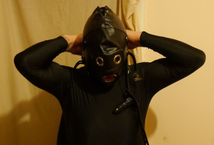 Once everything was ready I sat down and laced on my hood again – this time there was no hesitation and I stuffed the gag into my mouth, tightening the strap as far as I could. Weird how the silicon cock didn’t seem anywhere near as long or scary this time…