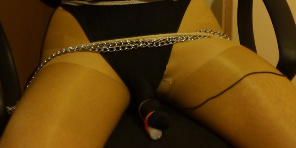 One of the things I love so much about this style of chair tie is lifting my feet from the ground and increasing the feeling of helplessness. I used rope and the ankle cuffs to tie my legs as far up as I could, causing me to swing around in the chair (the uneven floor of my house exaggerates this movement). Unfortunately the swivelling motion wasn’t what I wanted and so I had to resort to chains under the chair legs to stop the chair spinning too much (on other occasions the spinning movement whilst blindfolded and helpless has been an exciting addition to my play). I also used the chains to bind myself down to the chair seat. I attached the vibrator (on timer) to my sheathed cock with hair bands (worked very well) and placed all my bits and pieces in my lap and close to hand.