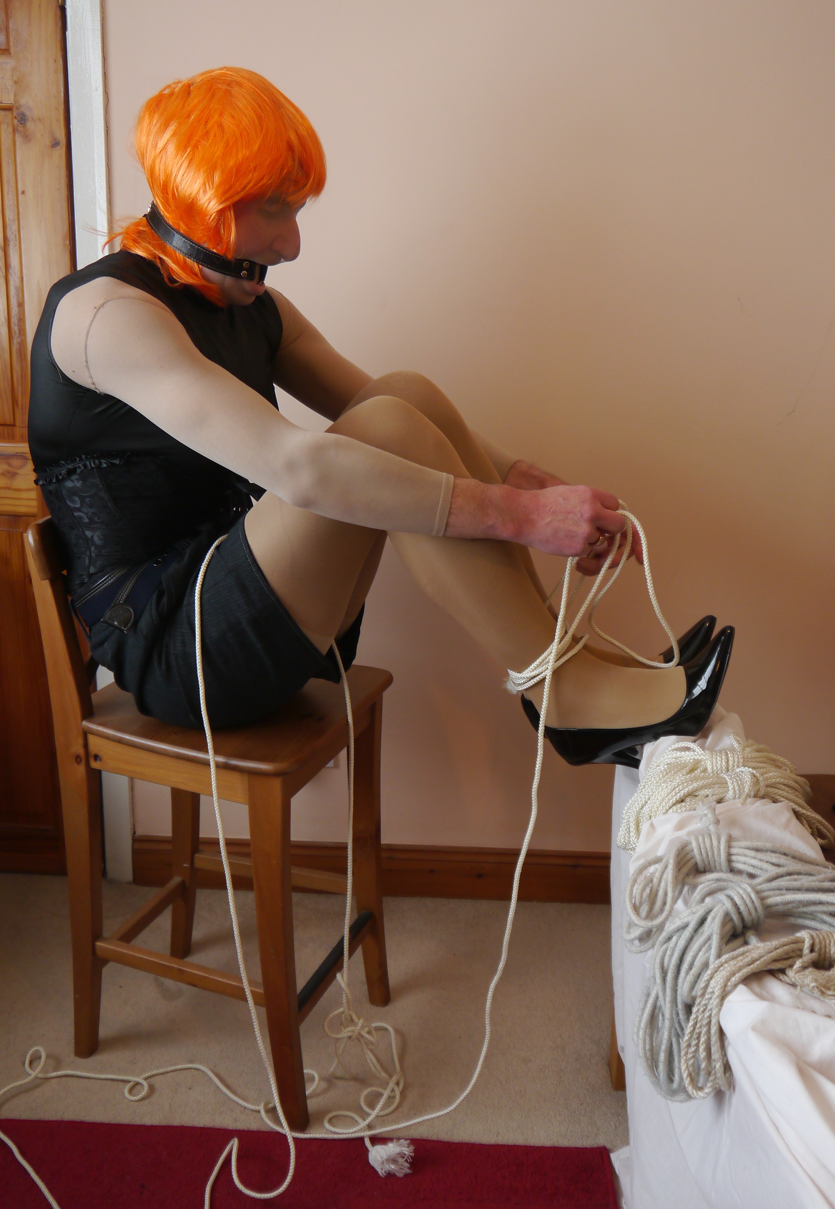 I was still nervous about an unexpected return by my GF, so my self-bondage was not going to include a timed release, but I did want to try out some different things. I was still wearing my bra and breast, but the penis butt-plug was replaced by my largest plug – I’m always surprised that once I’m ‘in the zone’ this plug goes in so easily. I also quickly tucked away my cock and balls (practise makes this easier each time) holding them in place with a combination of the two pantyhose suits. Over all that I pulled on my favourite pair of glossy tights, with their control top ensuring everything stayed in place.