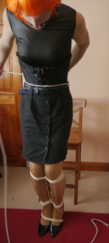 Time to add rope, and I had a fair supply to play with! Nothing overly complex with my bondage, just lots of loops around my legs and cinching them tight (including the top of my thighs, hidden under the skirt)