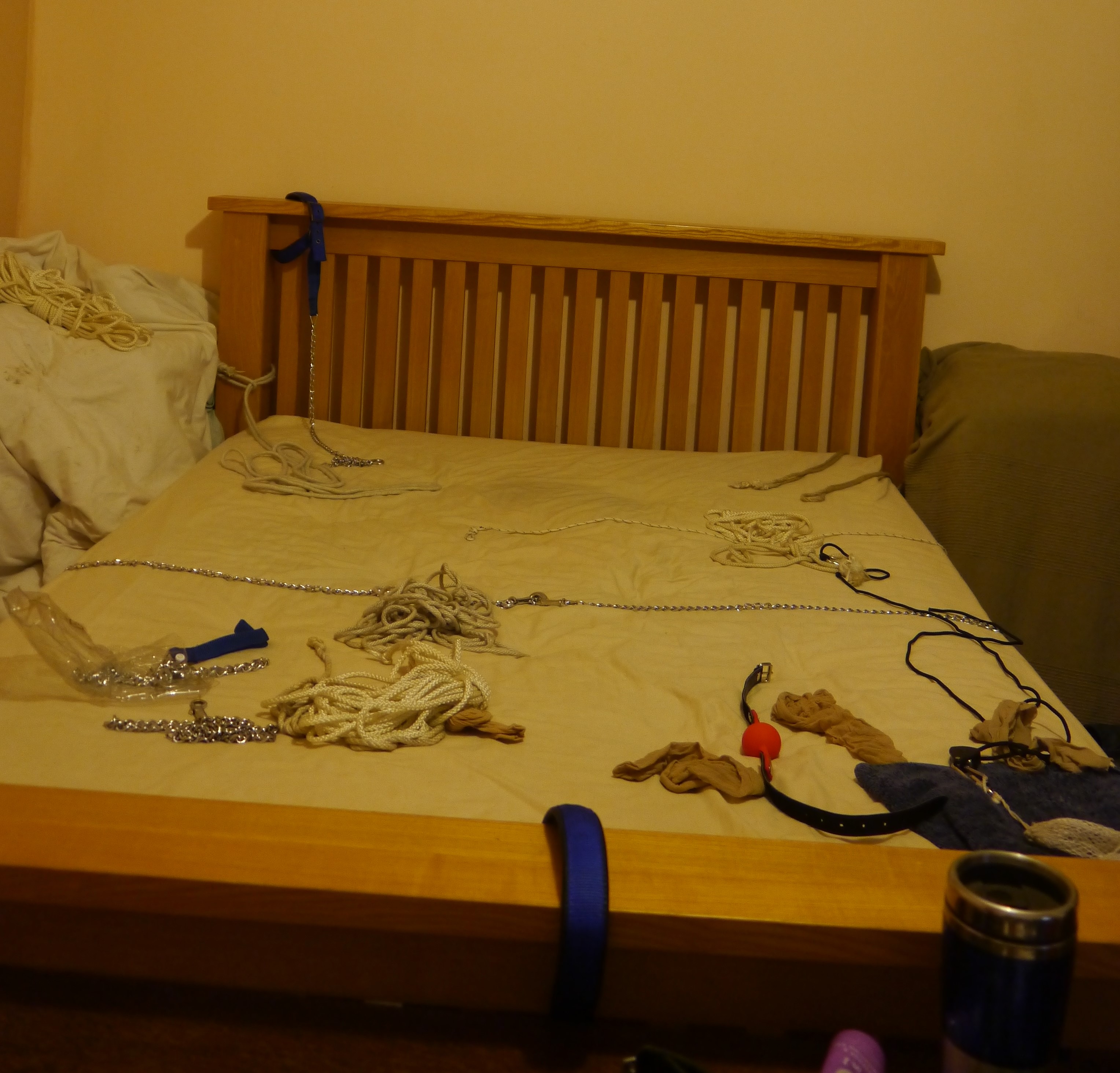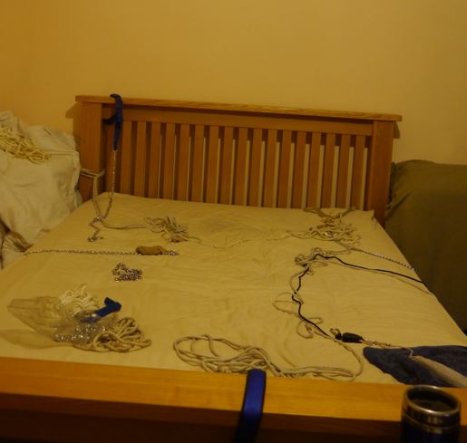 With that done I quickly prepared what I could on the bed. The intention was for a comfortable, but restrictive tie, something I’ve had great success with in the past. I was so confident about my arrangements that I almost didn’t set up an emergency escape (scissors on the end of a long length of cord) but at the last moment I did – thank goodness I changed my mind!