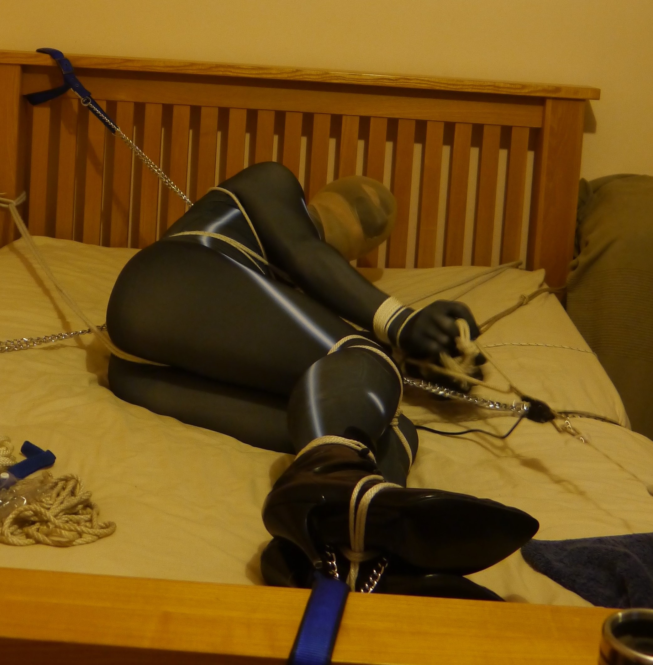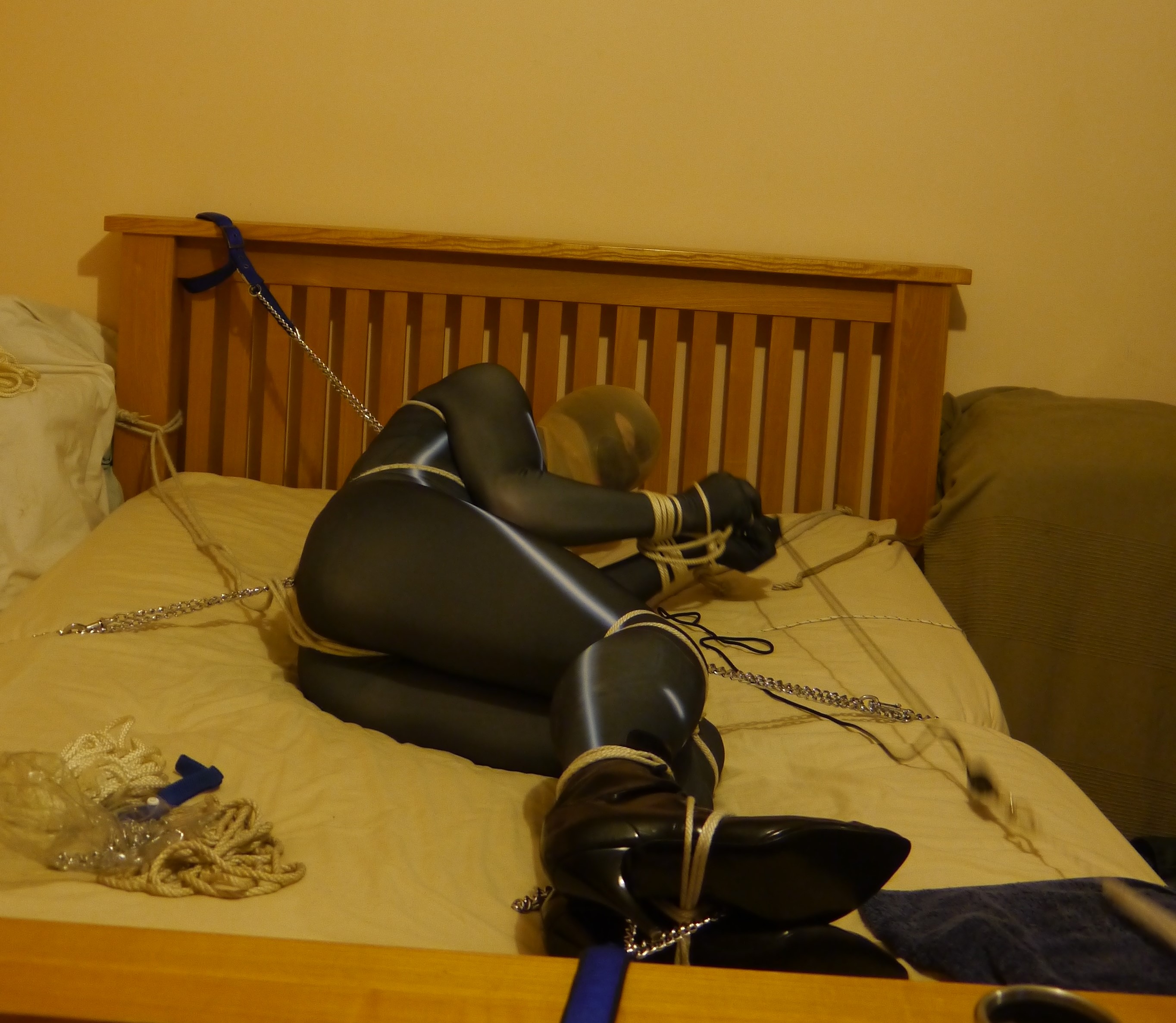 More chains followed as I did my best to fix myself in the middle of the bed. One chain was fixed to the back of my rope harness and another to the rope around my legs, above my knees. I put a couple of knee-highs over my head, both to make it impossible to spit out or remove the gag and to limit my vision and then a third chain was attached to a collar around my neck, further fixing me in place.