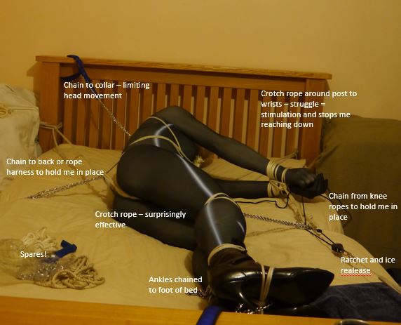 I’d also arranged a crotch rope coming from the top bed post behind me, between my legs and then around the other bed post to my front (see pictures) – with my tucked cock this proved to be surprisingly effective stimulation.