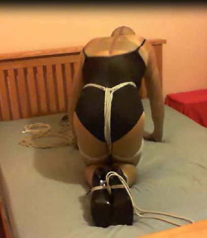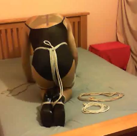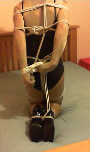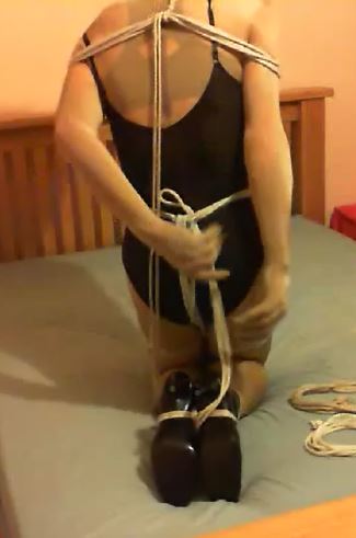 After admiring myself and playing with my boobs and nipples (again!) I set about roping my legs very tightly together. I wrapped and cinched rope around my ankles, above and below my knees and at the top of my thighs, before completing the lower body rope-work with a waist and crotch tie – the later helping keep my tuck in place and also forcing the plug deeper into my ass.