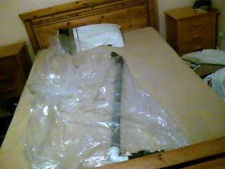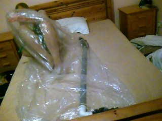 I moved the plastic bag to the bed, wedging the vacuum cleaner pipe under the foot-board to ensure it couldn’t move during my session. Inside the bag I added a 90degree angled connector pipe plus a 1m length of additional pipe (important tip coming up).