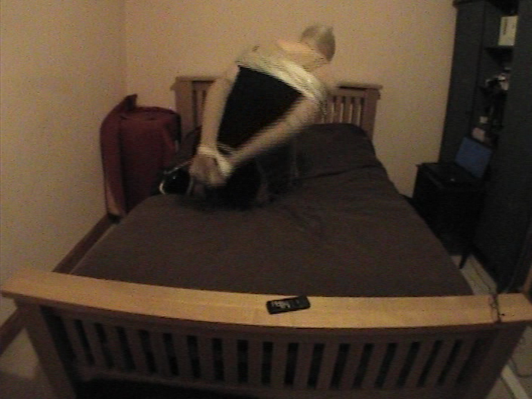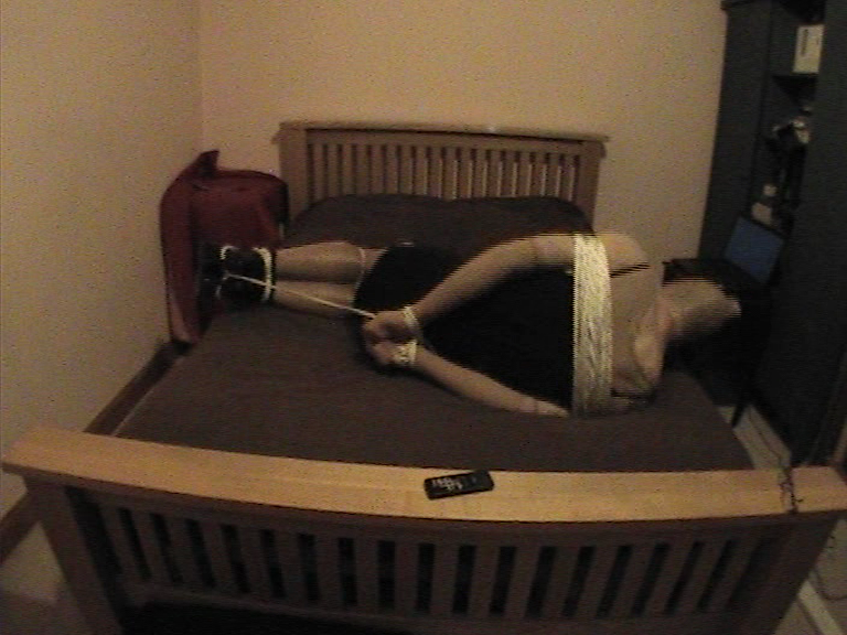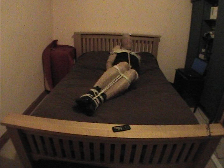 Legs tied and getting set – all dressed up and legs tightly tied, I’m balancing on the bed and working out the rest of my bondage. The gag is in place and my head is already covered in 3 layers of tight nylon.