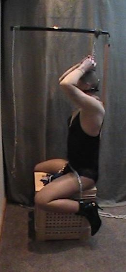 My penultimate chain went tightly around my waist and the vertical post, further fixing me to the frame of my DIY device. I quickly ensure my arms where encased by pulling 2 knee-highs over each hand.