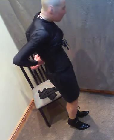 I could hobble around the room, tacking tiny steps and wobbling in my high heels, or sit on the chair. Sitting was fun on two counts; it forced the plug deeper into my ass and it positioned the top of the spreader bar right by my mouth – fun for pushing the ball into my mouth!
