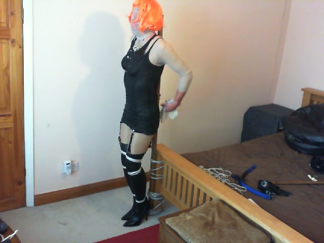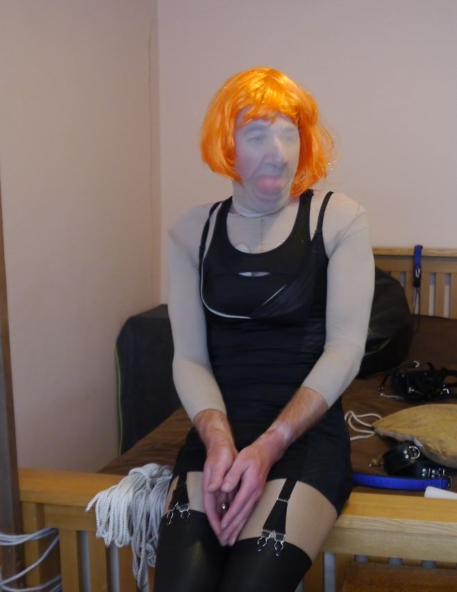This was always going to be a quick, hard, session and for that reason I didn’t wear my corset (it takes a long time to get on and would make the pole tie too difficult) but I did add in my cock shaped butt plug and a large ball as a gag. I also fancied giving my orange wig an airing, something I find I’m more and more ‘into’ as part of my fetish fun these days.