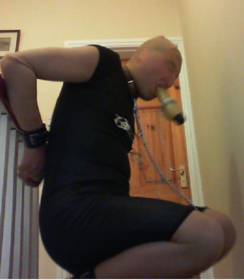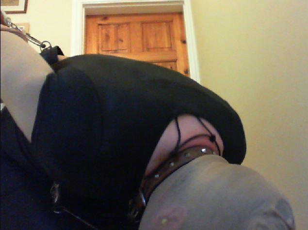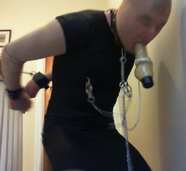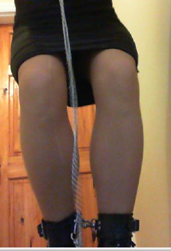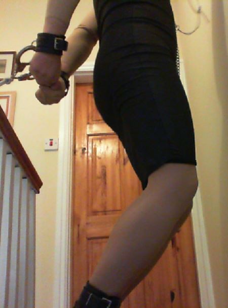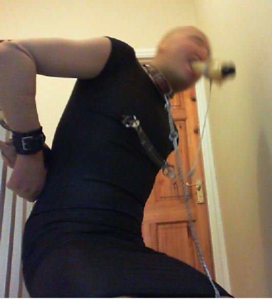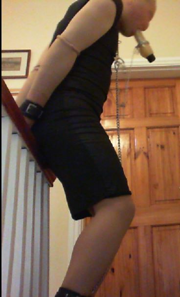 I wanted to add more to the session though; the first step was to hobble my ankles together (using the cuffs again) and to chain my ankles to my neck collar, making movement just that little bit more difficult. Finally I would ‘force’ myself to walk for my freedom by cuffing my wrists together with a combination of wrist cuffs and hand-cuffs, but placing the key to my handcuffs a good distance away at the bottom of the stairs (I would start at the top). I also added a final twist by roping the handcuffs to a point downstairs to prevent me getting close enough to the wall to easily rest from sucking/holding the dildo in my mouth.