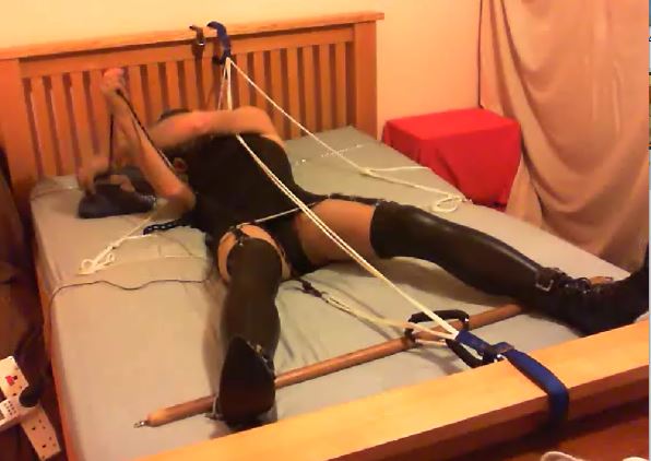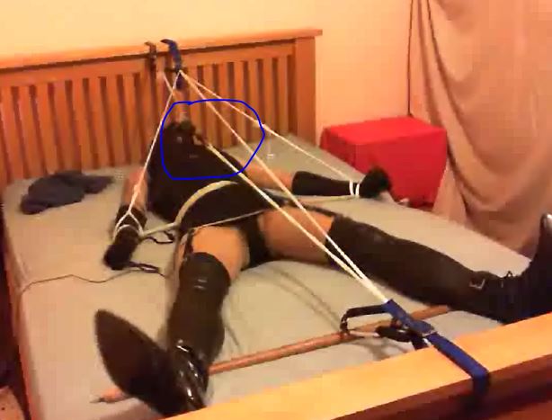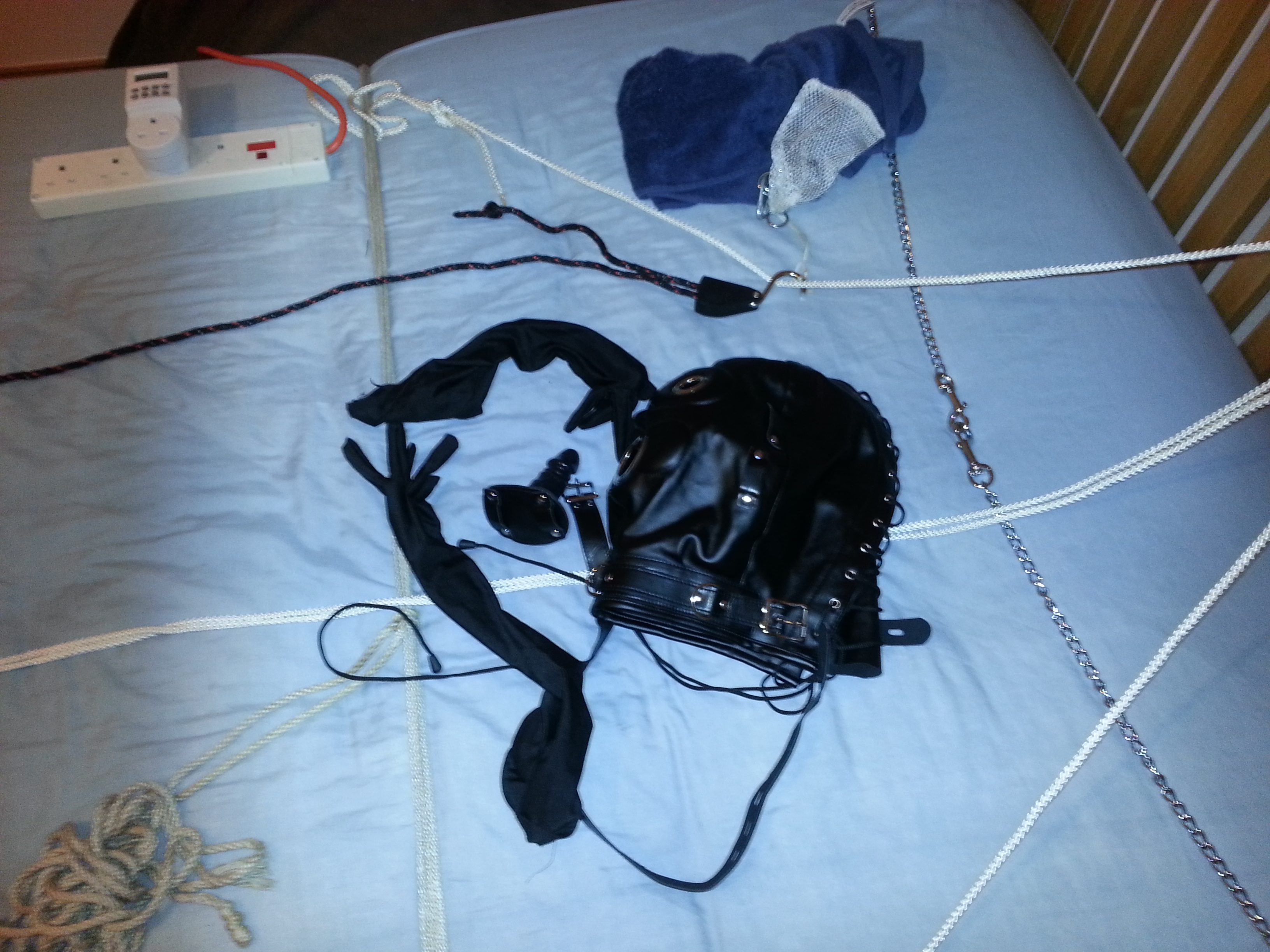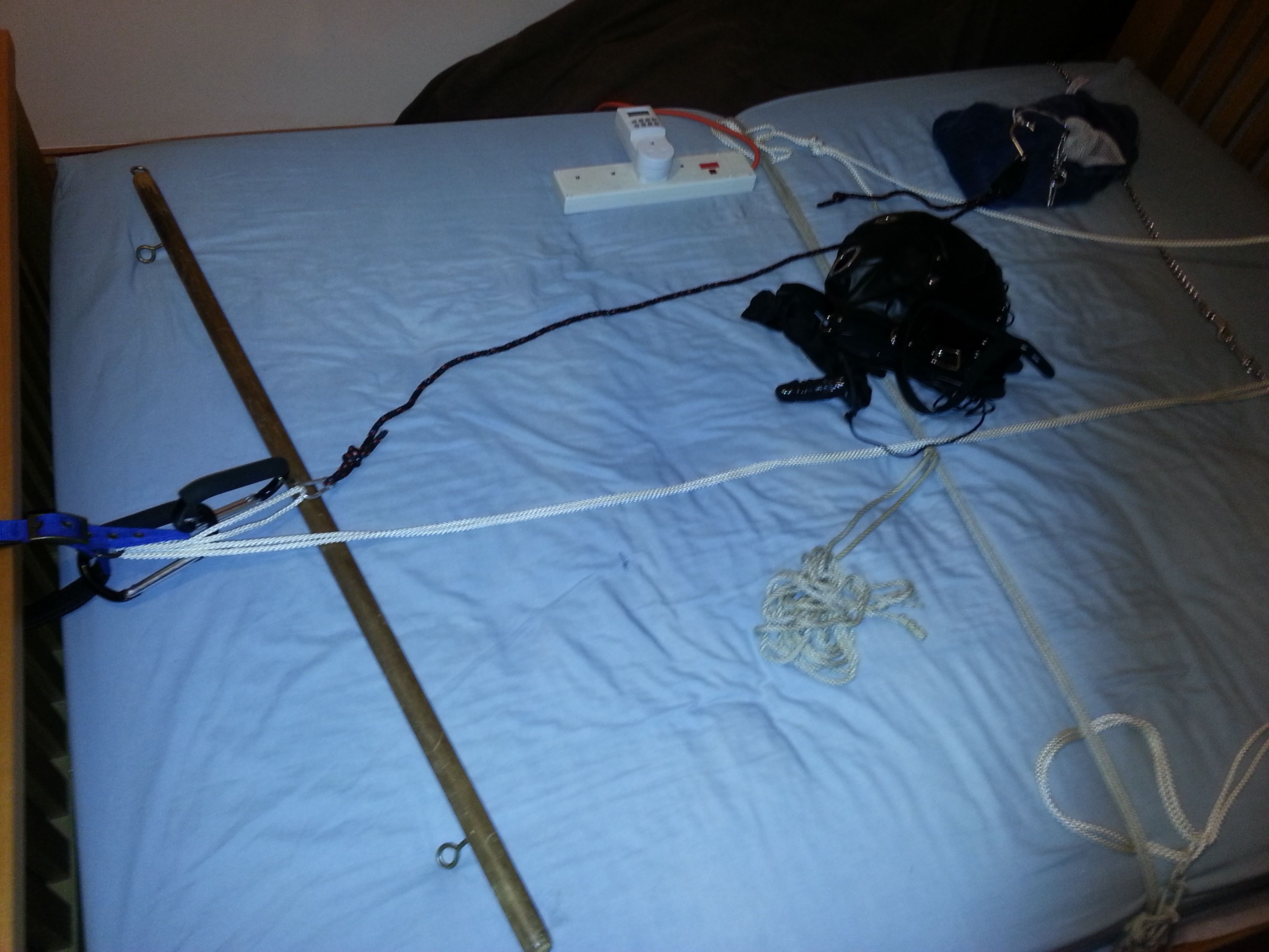 The spreader bar was fixed to the foot of the bed using a dog collar and D-link – I also pre-threaded the rope I was planning to use for securing my wrists through the collar D-ring to the rope ratchet. More rope was set in place mid-way up the bed, so be used for both my wrists and waist. Finally I fixed two chains, from each corner of the bed head, to be used to fasten my hooded head in place.