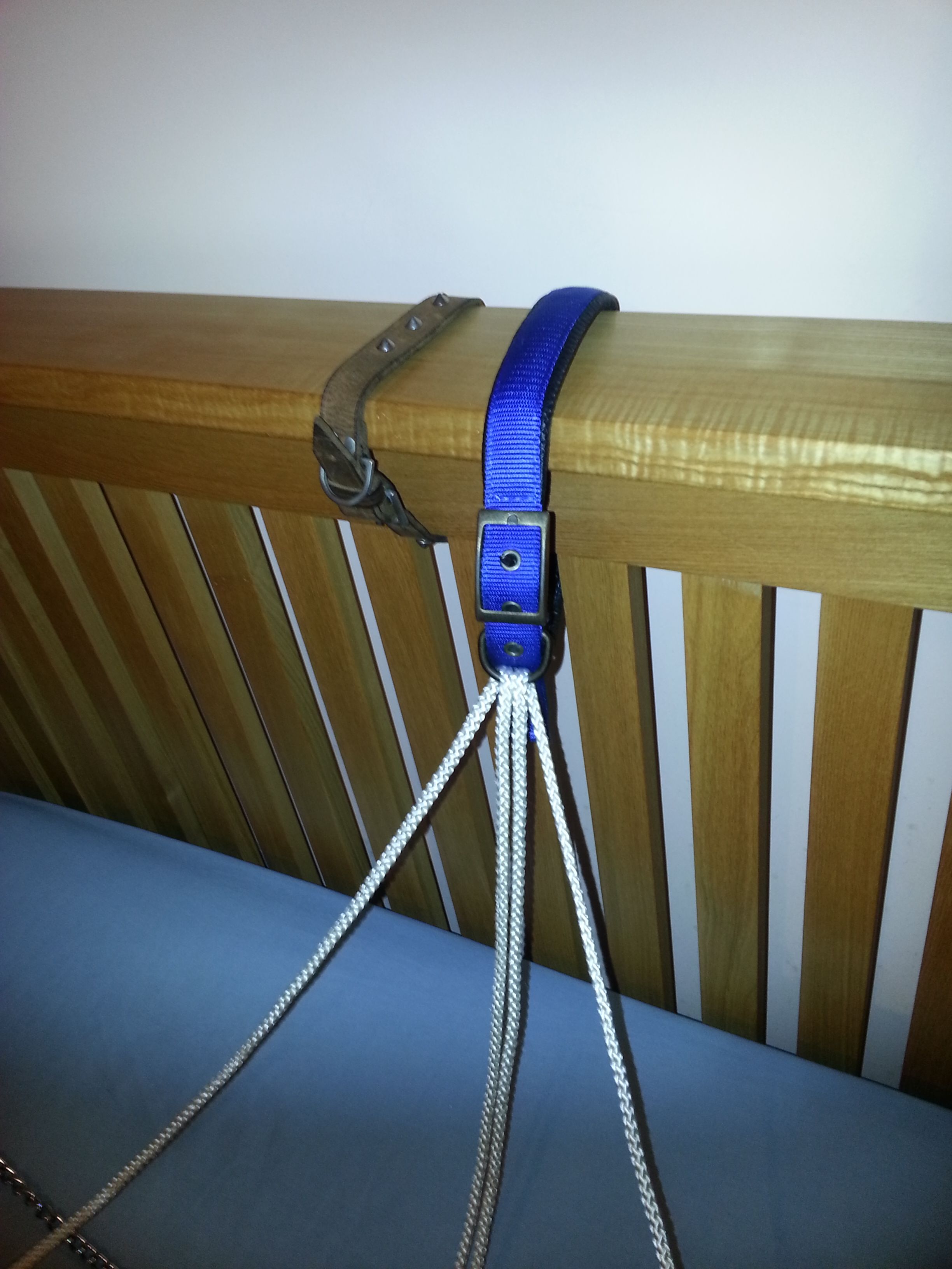 The final part of my preparation was to fix two collars to the head of the bed; one was to act as a tether point for the ropes securing my wrists and the other as the anchor for my rope ratchet and ice cube filled laundry bag (more on that later). With my set-up ready it was time for me to get dressed.