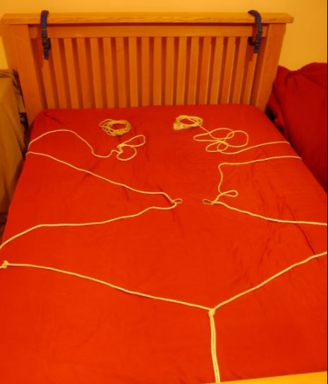 I know it sounds obvious, but when you play on your own there are some things you have to get ready before starting. This is the set-up using ropes, clips and collars to tether me to the bed.