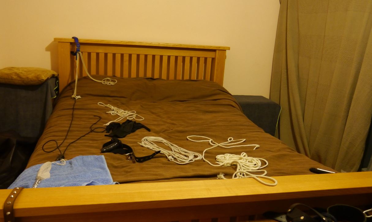 – I’ve slipped a ‘noose’ of rope down my right arm; this is attached to the rope ratchet and will used to cinch my wrists tight. I bind my wrists with a separate rope, using the ‘figure of eight’ method. The black rope, lying on the bed, is what I will use to pull the ratchet tight.