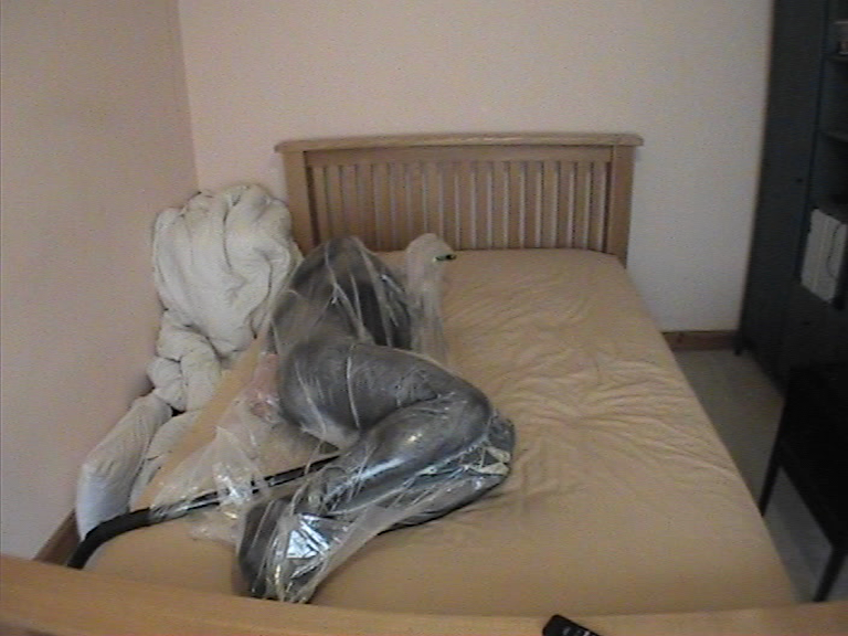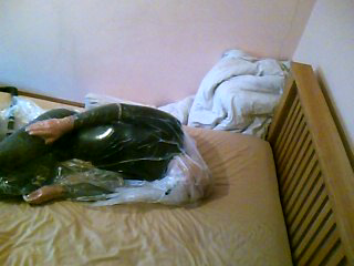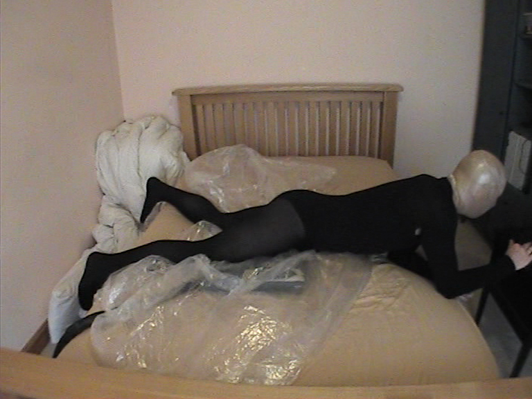 I’ve stuffed my mouth with my home made ‘penis gag’ and then wrapped multiple layers of cling film over my head, making sure I open up the hole on the gag to breathe through. It’s already quite hot inside my plastic hood as I pull on two laddered knee-highs to almost complete my encasement and climb into the bag on top of the bed and set the video recorders running.