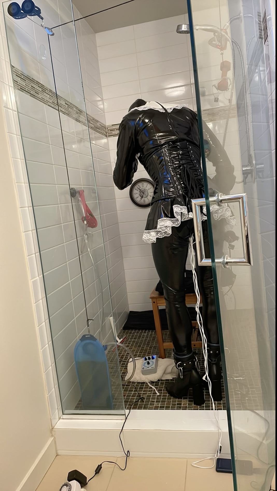 PVC French maid dress over PVC catsuit with PVC boots and PVC hood.