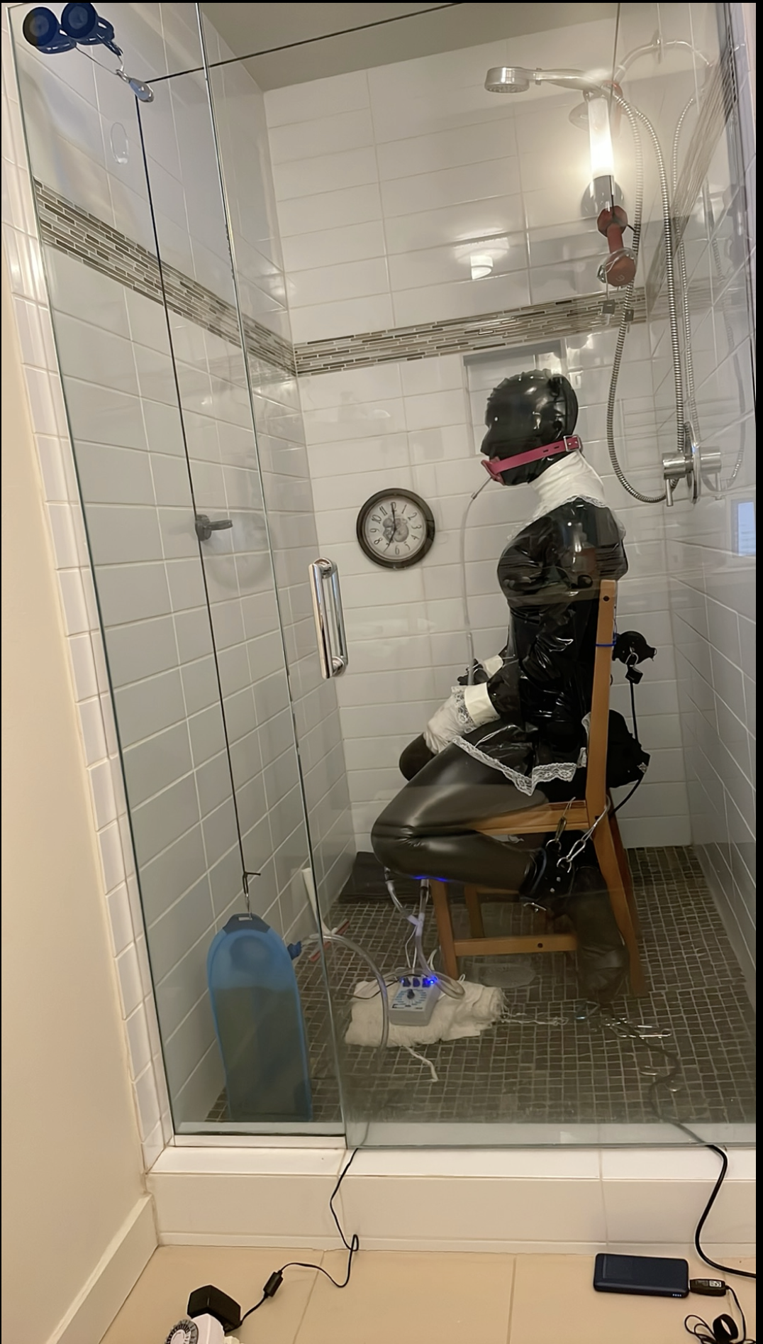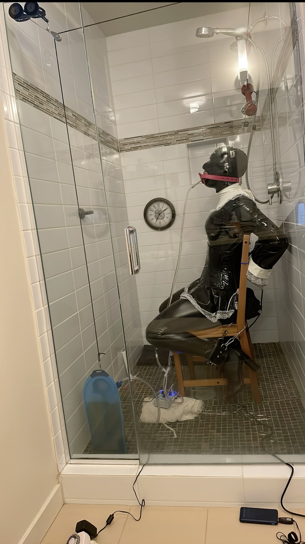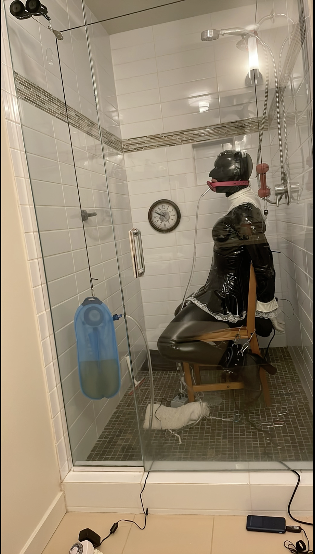 So, if I suck and drink quickly enough, the reservoir gets light, the weight drops, and I am free. If I need to relieve myself before the weight drops then I have more to drink and the longer it takes the more interesting the concoction becomes. I started the session very well hydrated.