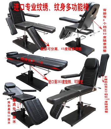 Tattoo beds tend to have arm and leg rests that can move independently. And the whole thing can be set up as a flat bed, and is height adjustable too.