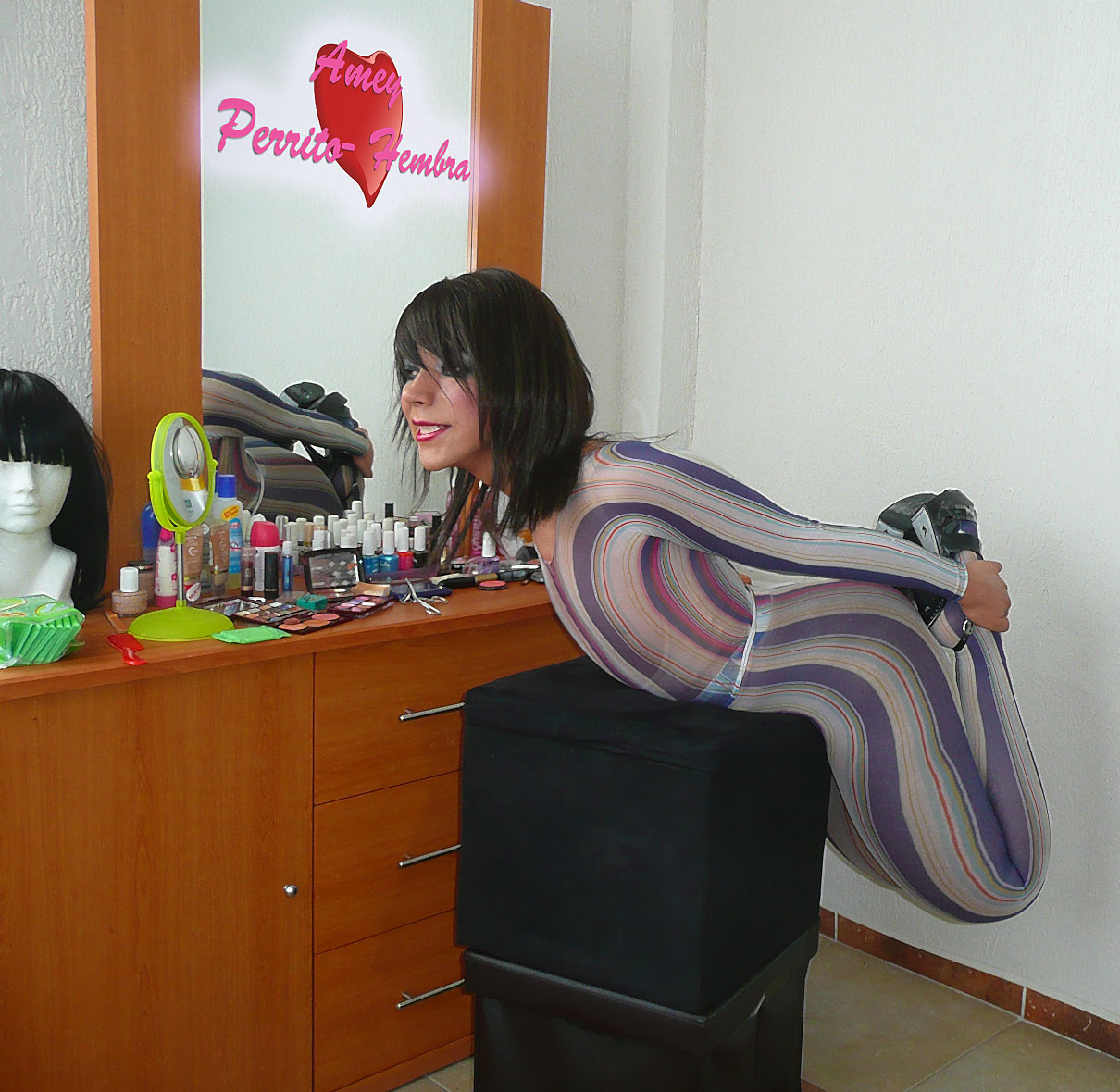 ...that's the title of a recent set on Amey's Flickr. This is the way yoga should be practiced, not in hideous yoga pants but in layers of nylon with high heels, full make-up and your '...ano penetrado por un pequeño vibrador'. That last item probably accounts for the expression on Amey's face in some of the pics... 😁