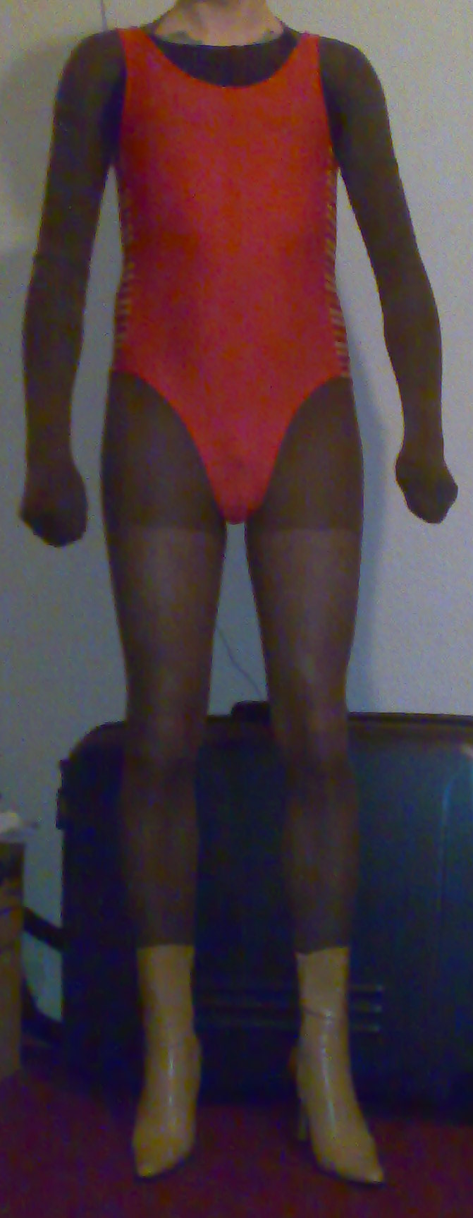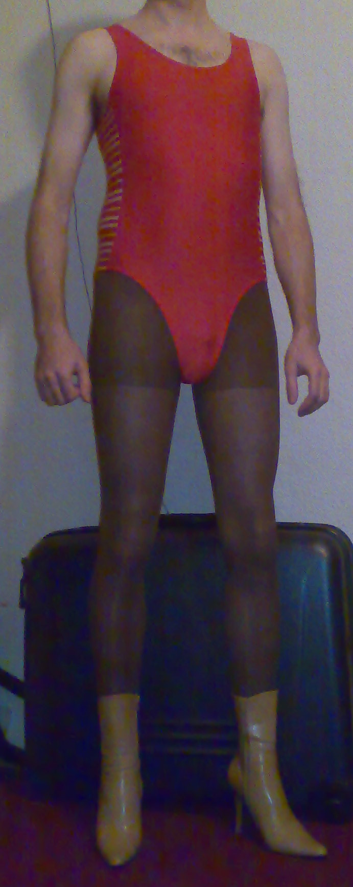 Pic1: Boots with 10 cm high heels, a red swimsuit, compression pantyhose, thong underware and this chastity device.
