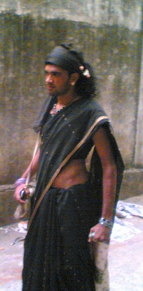 Except for the bandana on his head, the first guy is wearing the sari in the Nivi-style, which is the most common style for women these days. He is even wearing the typical blouse. Clearly cross dressing, but he still looks like a man.