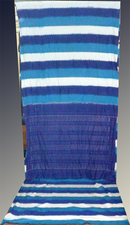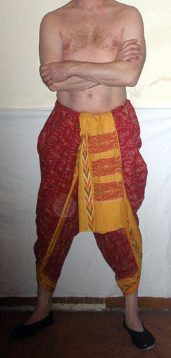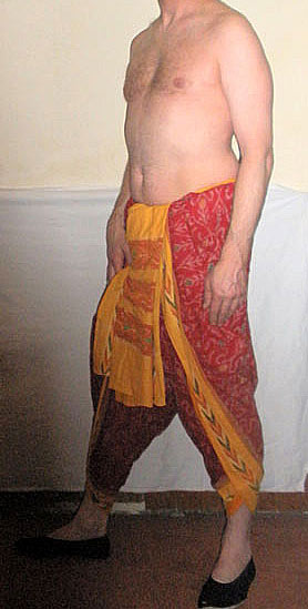 A sari is a traditional Indian garment that was created thousands of years ago. It consists of a single piece of cloth, usually silk or cotton, these days about 5 yards long and 1 yard wide, that is wrapped around the body in artful ways to create a beautiful dress. Ancient styles covered the legs and hips only, documents and sculptures show, that saris were worn by men and women alike, only in slightly different styles. Today, saris are officially worn by women only and for modesty reasons, come with a petticoat underneath and a small top that covers the breasts but usually leaves the navel free. For men, the inheritance is the dhoti, which is a smaller piece of cloth wrapped around hips and legs. Women's saris are often decorated with paillettes, small mirrors, embroidery and printed or woven patterns. Mens dhotis are usually white, with one or two coloured stripes and sometimes a border on the long sides.