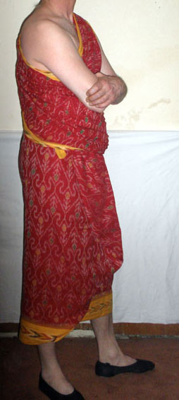 If this sounds interesting to you, you can start with a simple bed sheet, which is too short for a real wrap, but enough to make a dhoti or a basic sari-style mummification. For the real thing, look on ebay. There is a huge selection starting at prices around 10 Euros. I have also ordered some from India, with pre-stitched blouse to measurements. It costs more from India, but the same quality of cloth would be twice or three times the price in Europe. A petticoat is very helpful for learning the wrapping styles, but not really needed. As I said, petticoats were introduced for modesty reasons, probably when the British colonised Asia. The blouse isn't necessary either, but it helps maintaining the wrap, and the pallu - the part of the sari that is falling freely over one shoulder - is often fixed to the blouse with a safety pin. There are lots of wrapping instructions on the internet. If that is not enough or if you want to know a particular style, send me a private message.