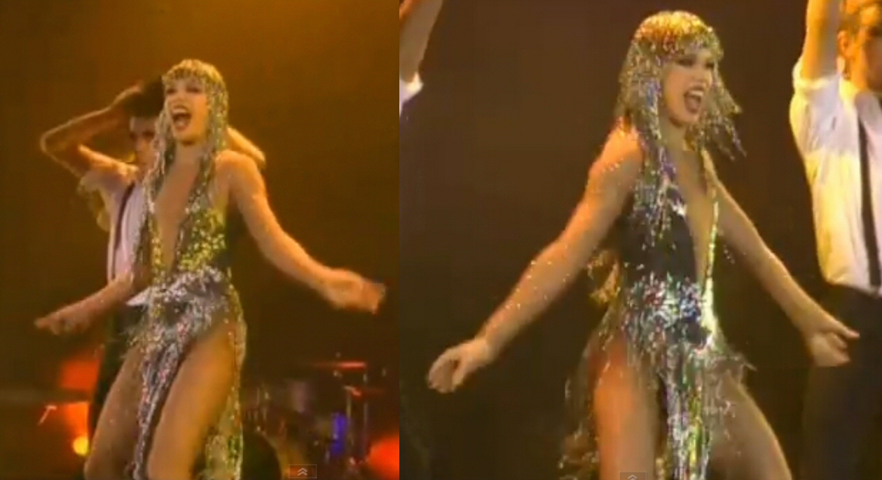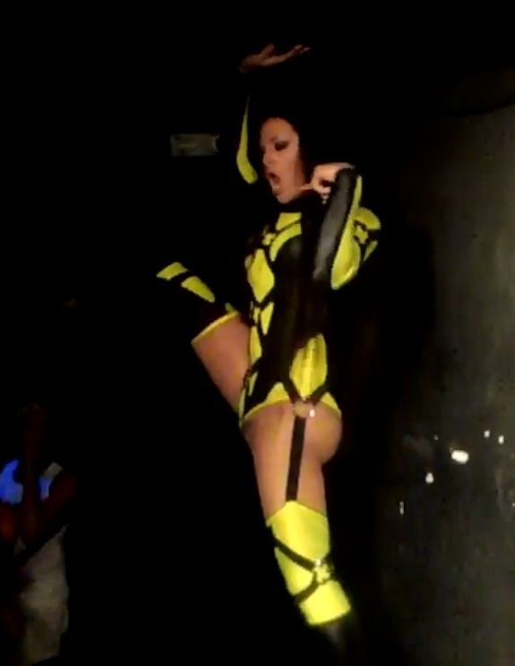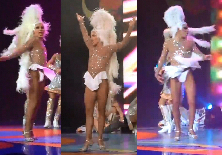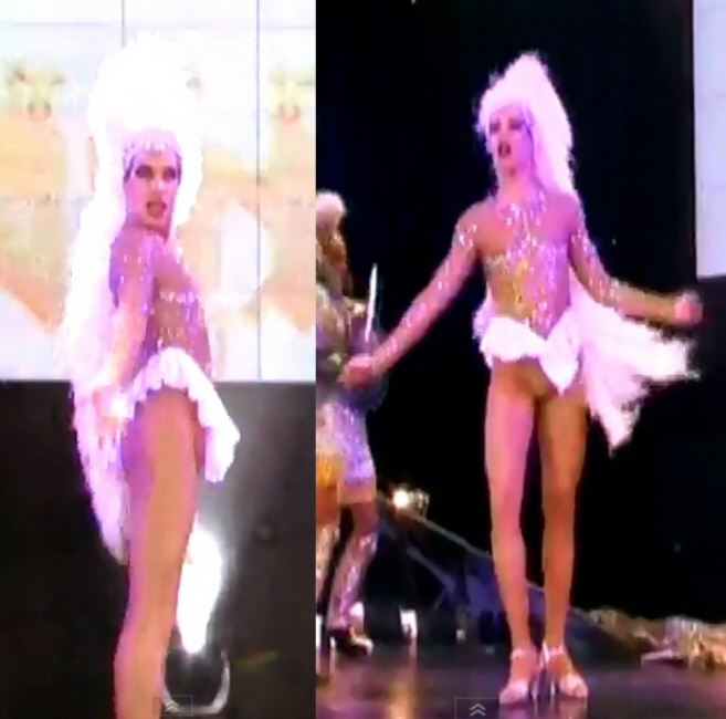 Sarah Colker's very athletic drag act starts of with a great costume but a rather poor tuck that goes rapidly downhill. Still, it's an excellent example of why to wear shiny sheer-to-waist tights with your leotard 😉