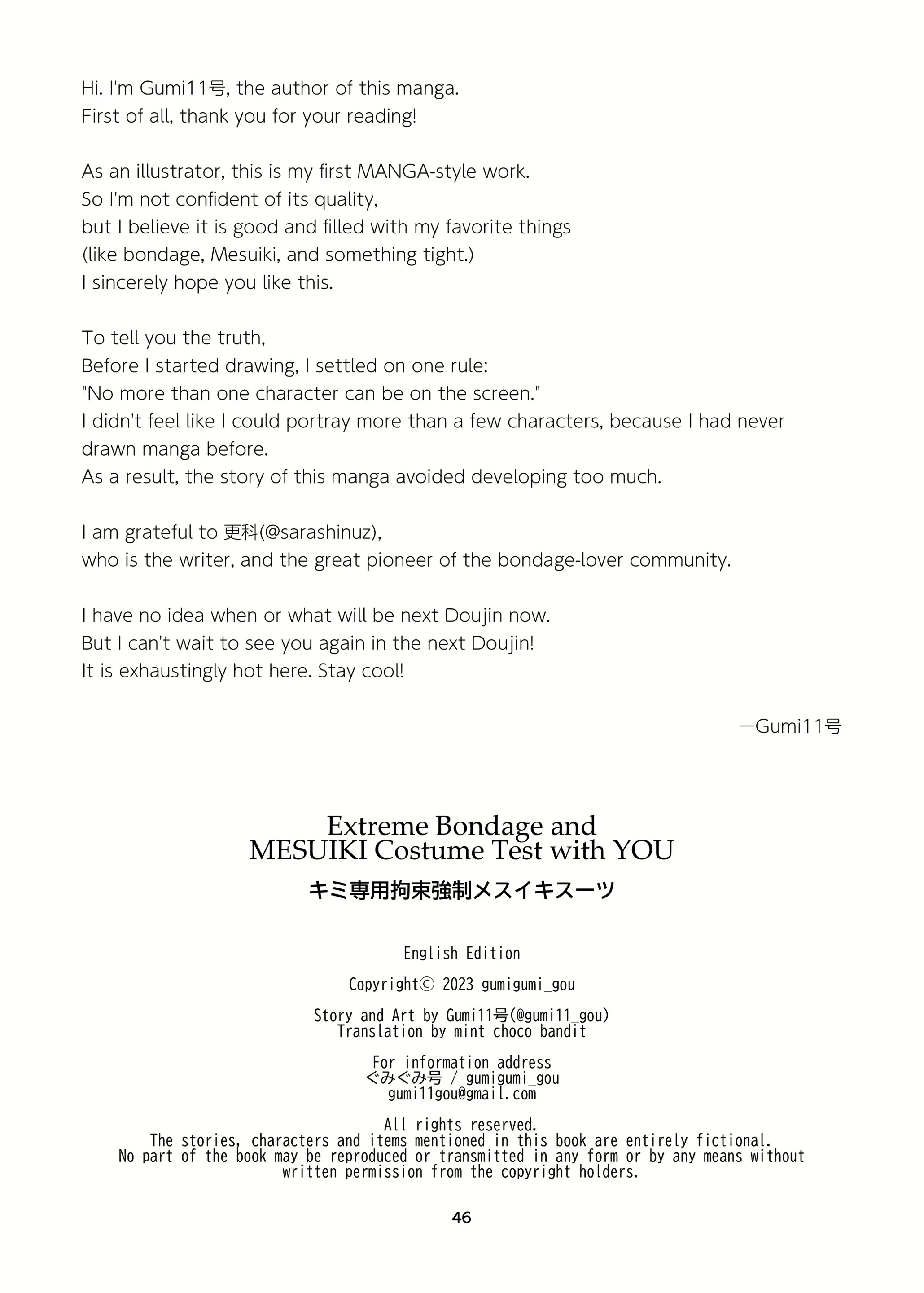 I've finally found an English translation of what's my favourite heavy rubber bondage comic ever, Kimi Senyou Kousoku Kyousei Mesuiki Suit by Gumi11. Feminisation, butt plugs, sounding, chastity, ballet heels, this has it all.
