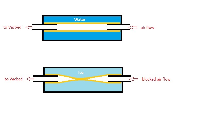 This is my idea for a Vacbed ice lock! It works with the expanding force of freezing water. Water has the feature to expand 8-10% when it freezes. I think it may be possible to use this feature, to squeeze a piece of silikone tubing, which is inside a metal pipe.