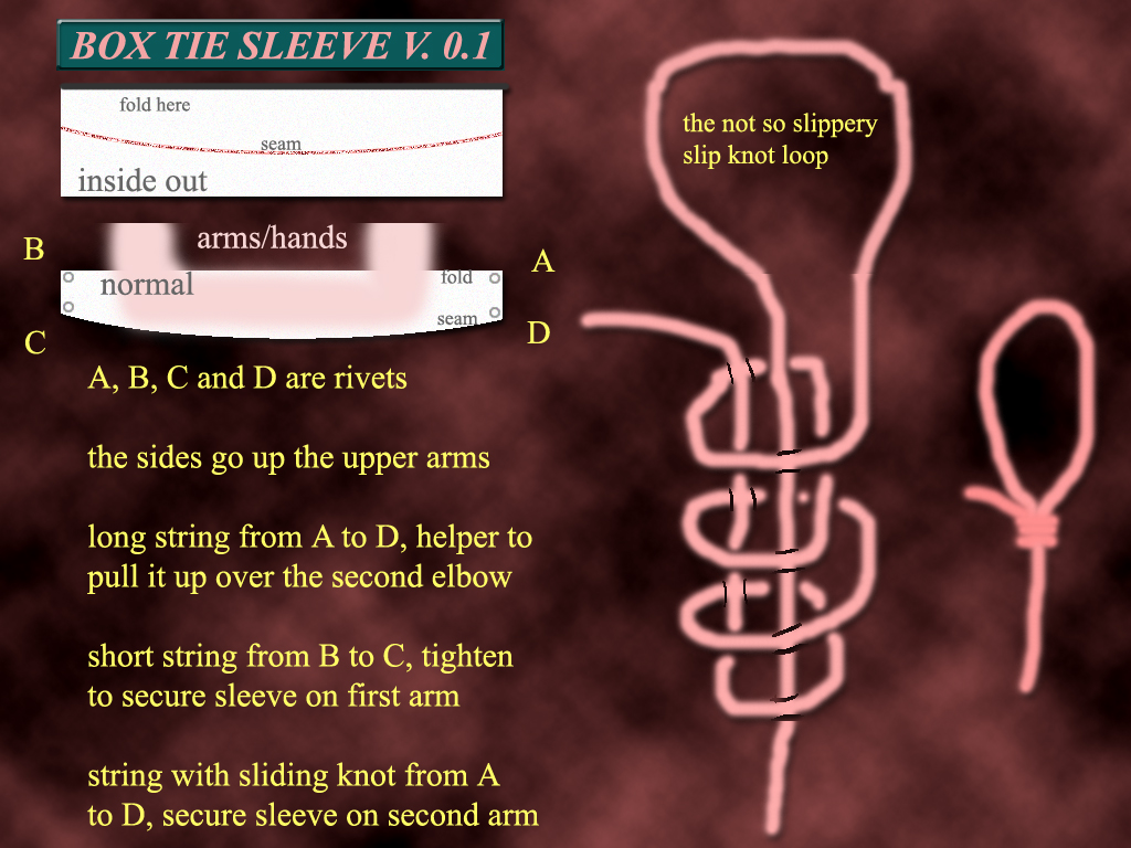 For partner bondage, I would simply run one or two sets of laces over the length of the sleeve. It is still an option for the SB sleeve, but it will be difficult to make a tightening system. So for now, I have a string going through two eyelets, with a special "multiple sliding knot" that I developed for this purpose. The knot is almost as simple as the normal sliding knot, except that you wrap the short end, that is not to be pulled, several times around the long end and then pull it through all the wraps. This creates lots of friction and holds pretty tight. The string only pulls together the eyelets, it doesn't go around the arm. This is important because otherwise it would cut off circulation quickly.